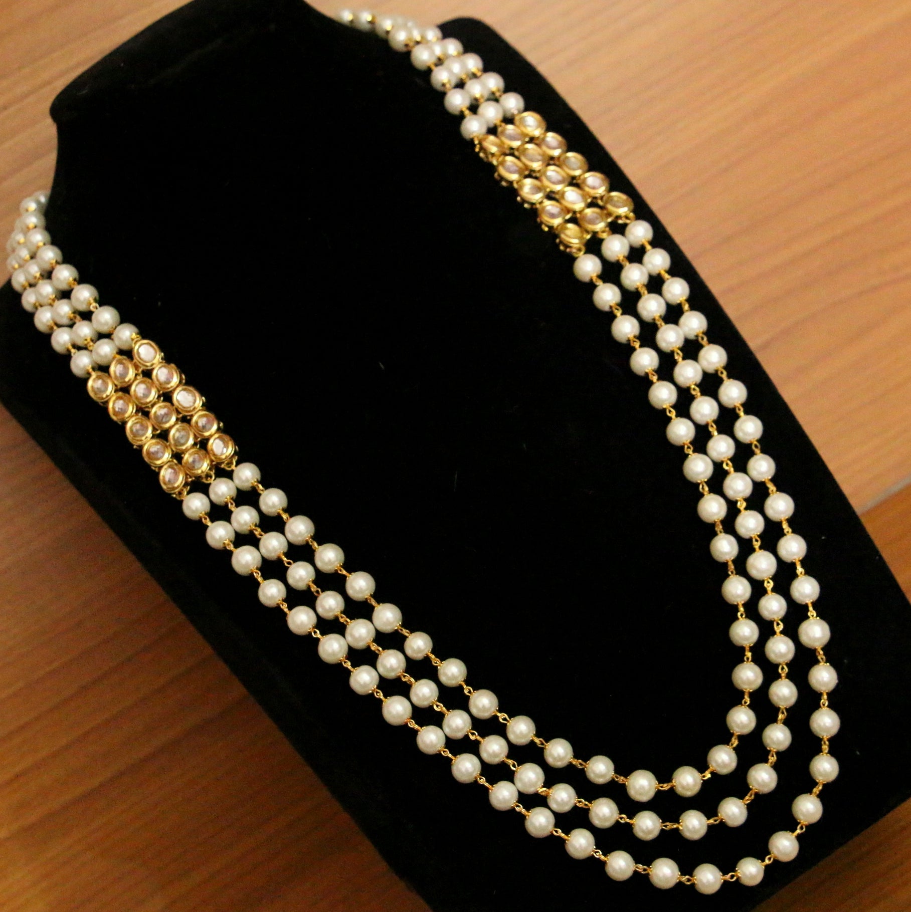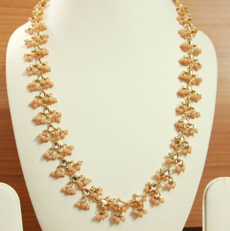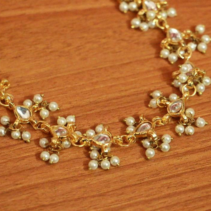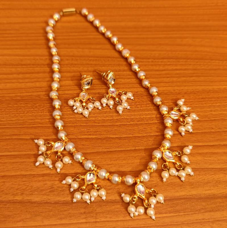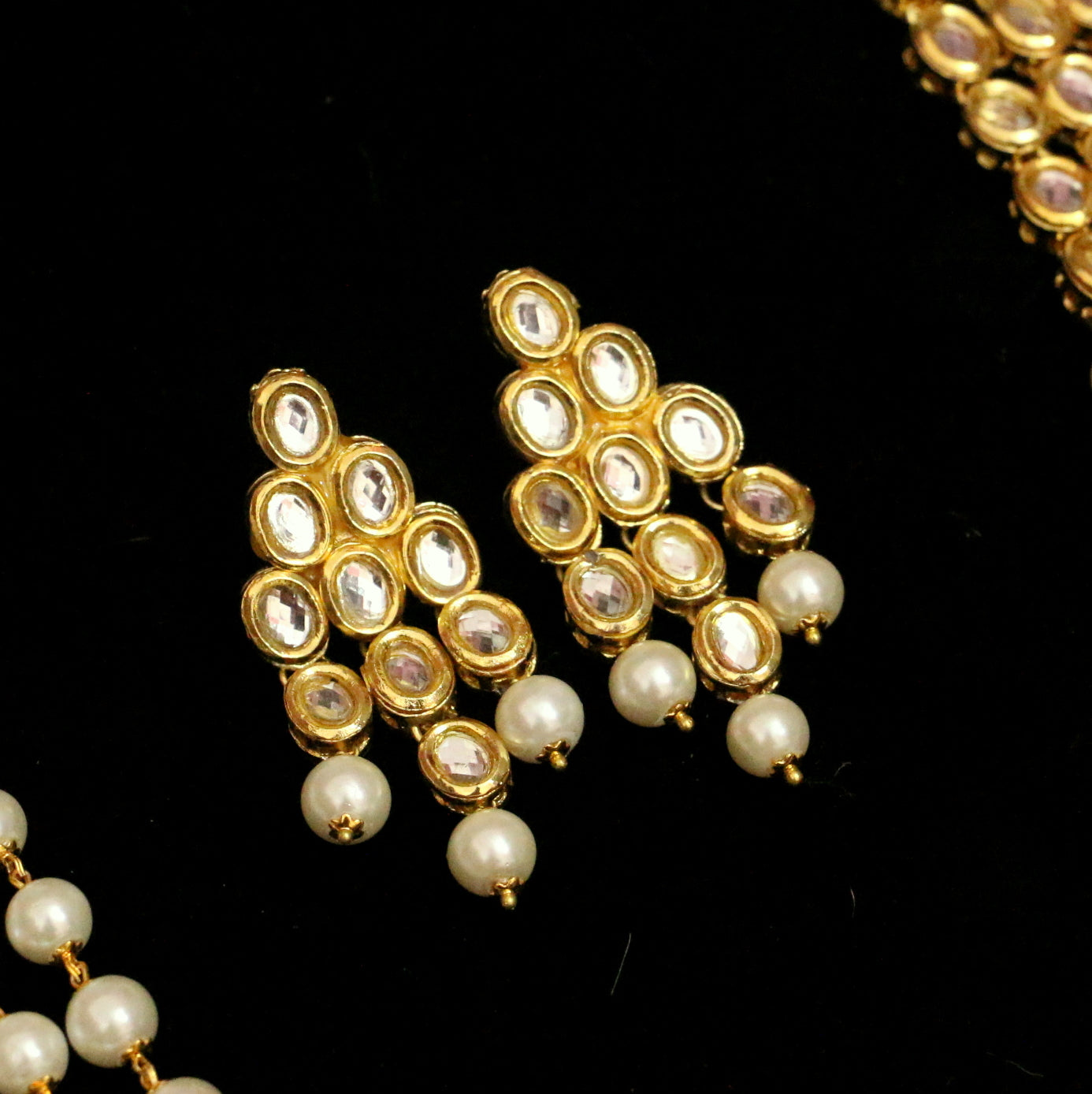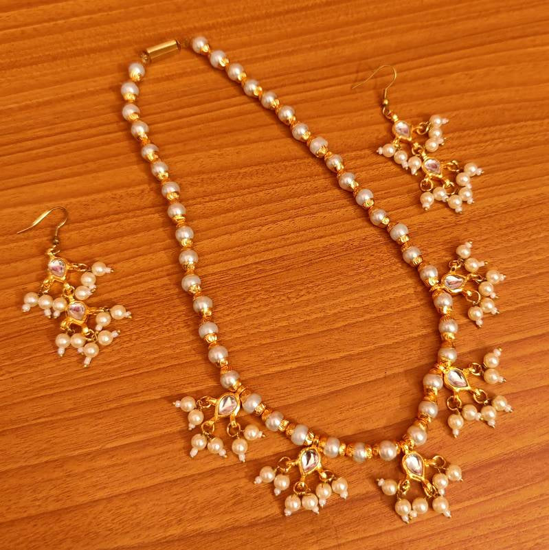 This Necklace is handcrafted is copper alloy and finished in gold plating , the stones used in this necklace are imitation kundan polki stones which are very fine in quality . The gold plating is nickle free and it gives a unique look to the necklace set and also the necklace is light in weight.