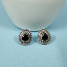 Add bold sophistication to your look with these 92.5 sterling silver black teardrop stud earrings, crafted with an oxidized finish for a timeless vintage appeal. The deep black gemstone centerpiece is beautifully framed in an intricate silver design, making these earrings the perfect blend of elegance and versatility.