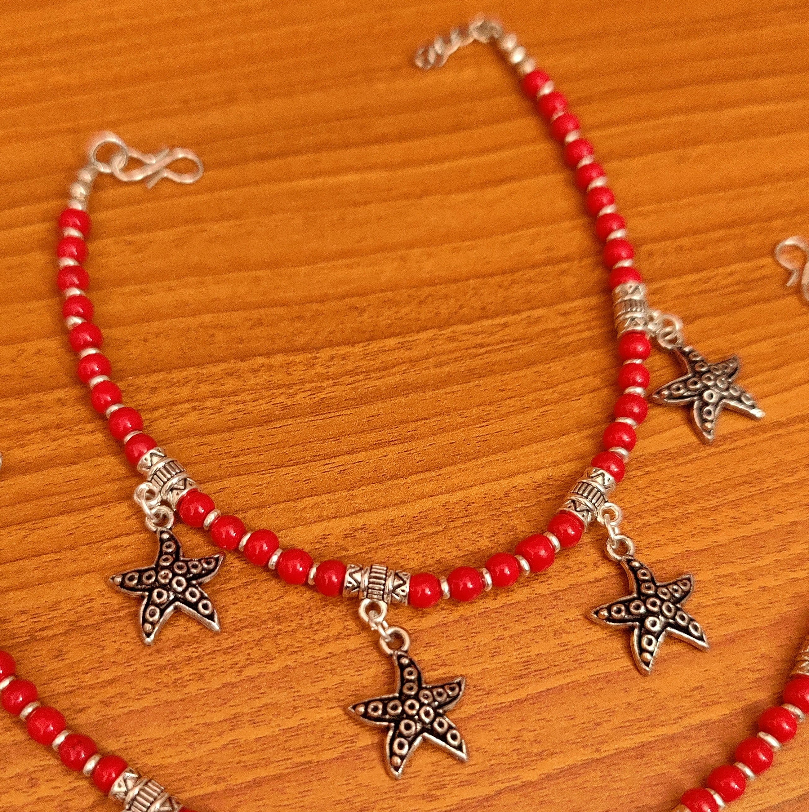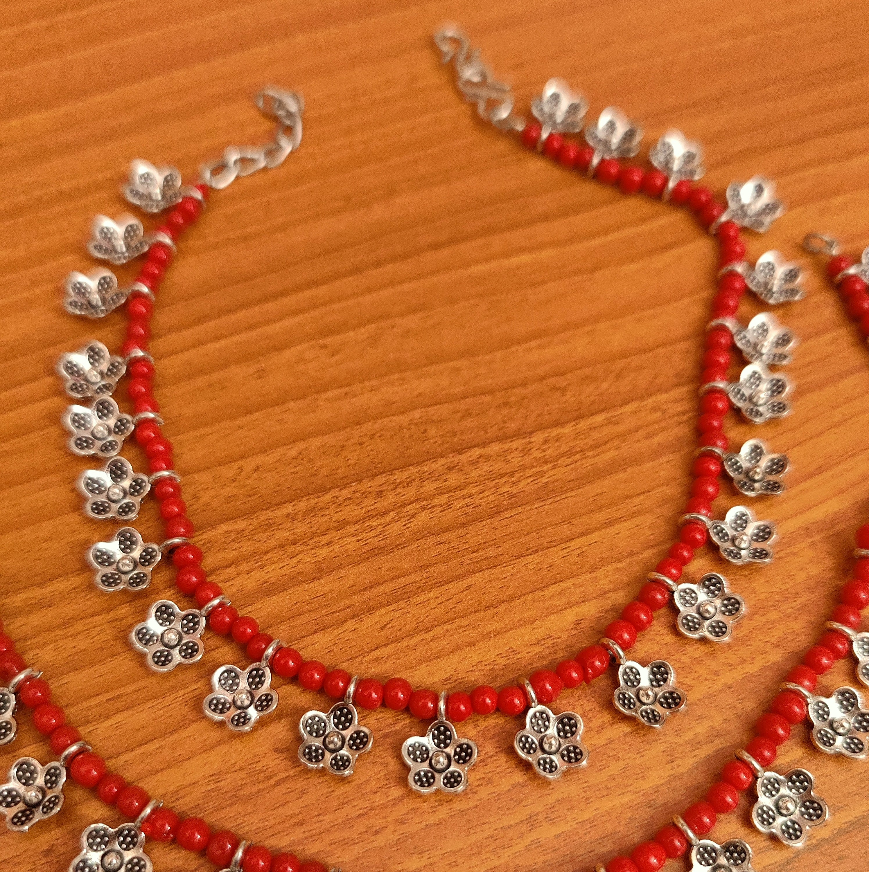 CORAL BEADS OXIDISED FLOWER PATTERN ANKLETS