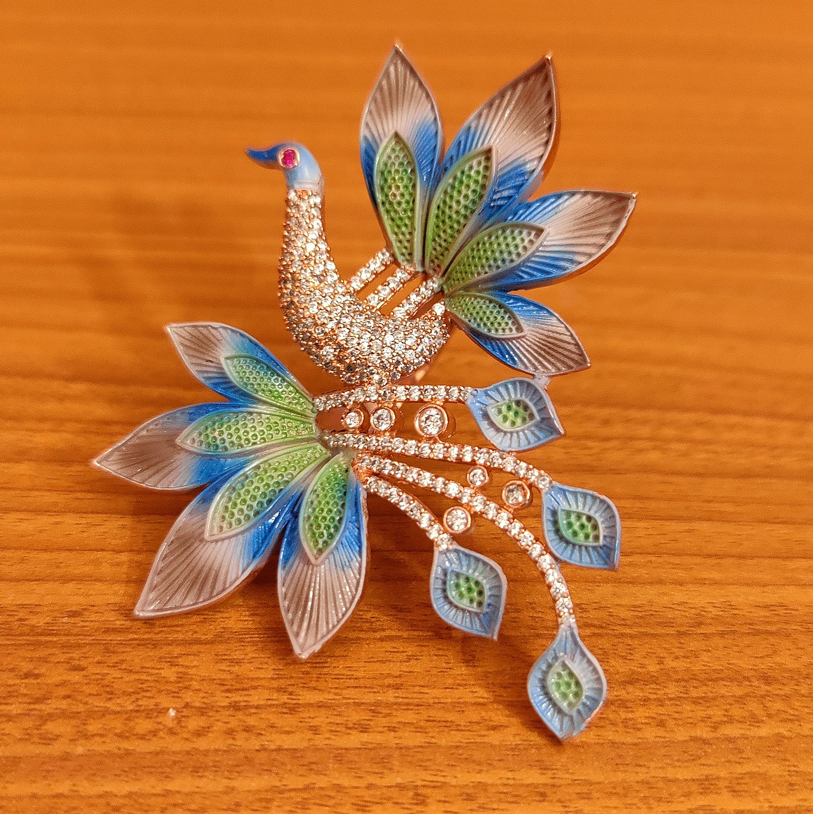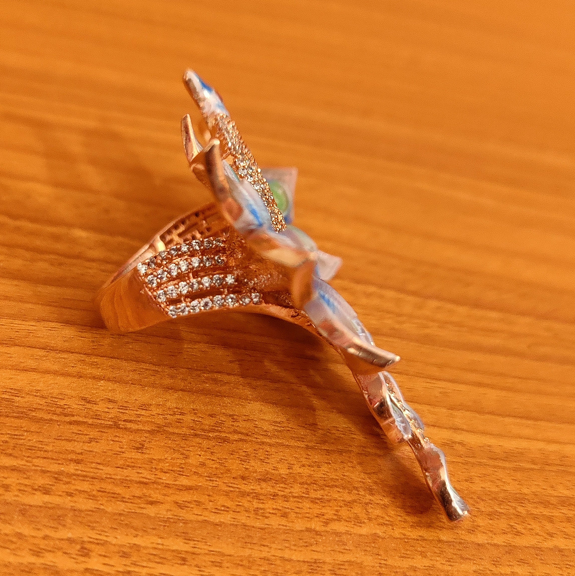 This pecock pattern beautiful ring is handcrafted in brass alloy with imitation cz stone of very fine quality , this ring is coated with 18 kt nickle free rose gold plating witch gives this ring a real diamond look