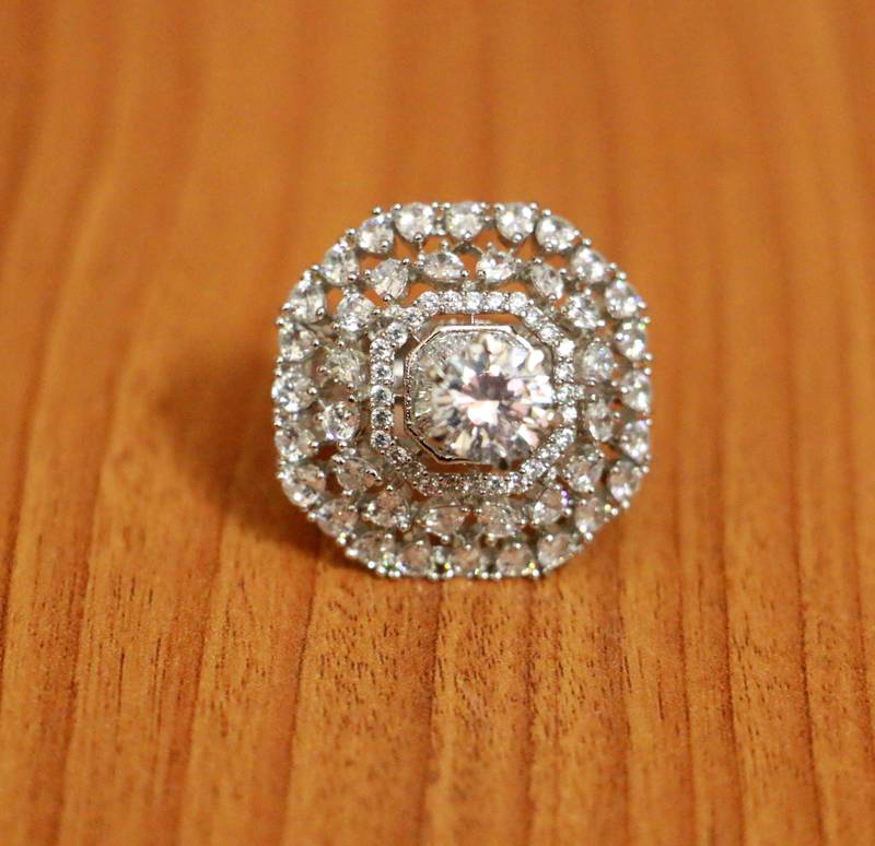 This Diamond Look Cocktail Ring Is Made In Silver Alloy With Fine Cubic Zirconia Stones And Is Plated With White Gold Rhodium To Give It A Real Diamond Look .