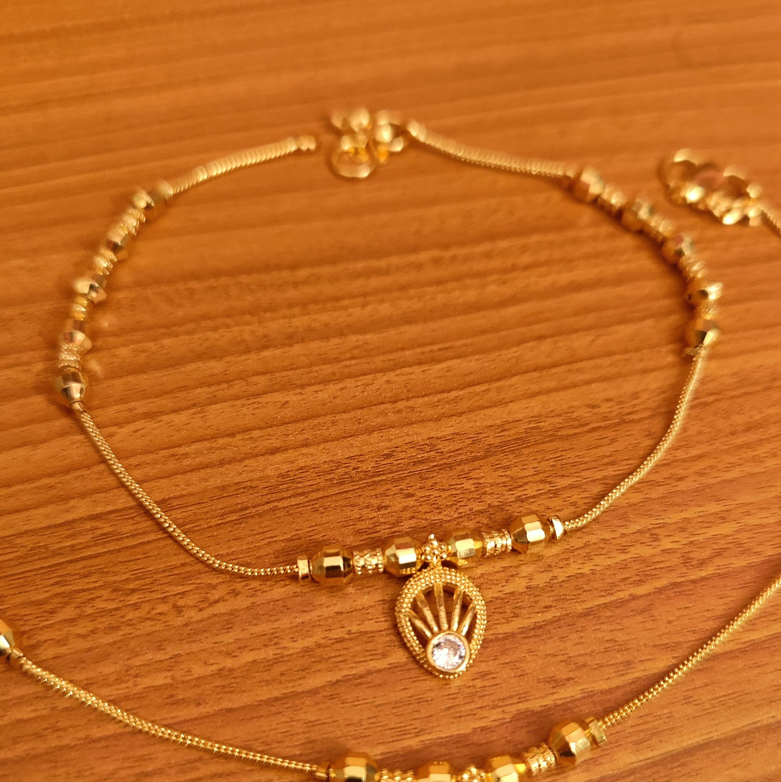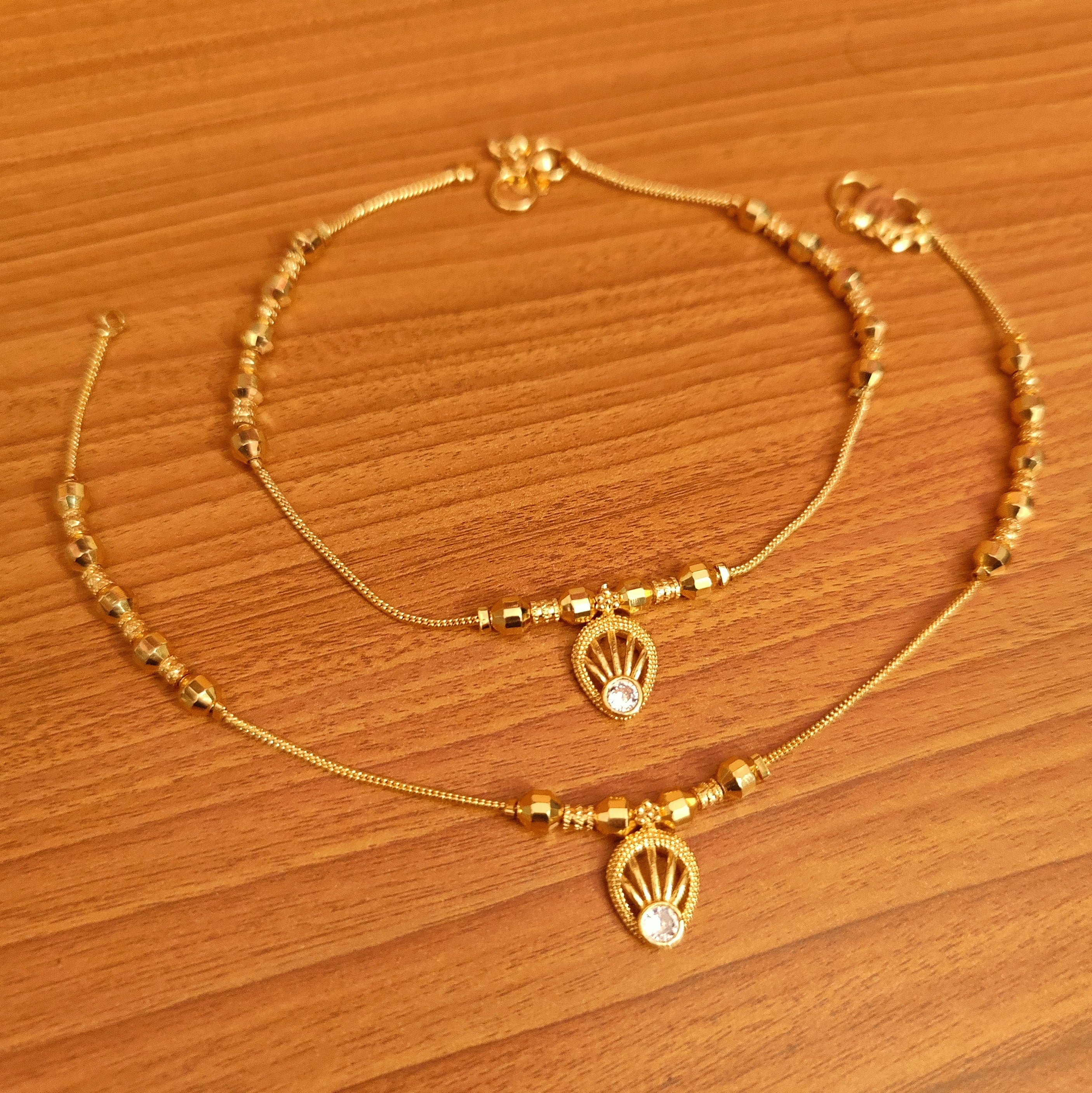 These gold plated anklets are handcrafted in brass alloy with fine cz stones and gold plated metal balls. These anklets are plated in 18kt fine gold plating and are very lght in weight.