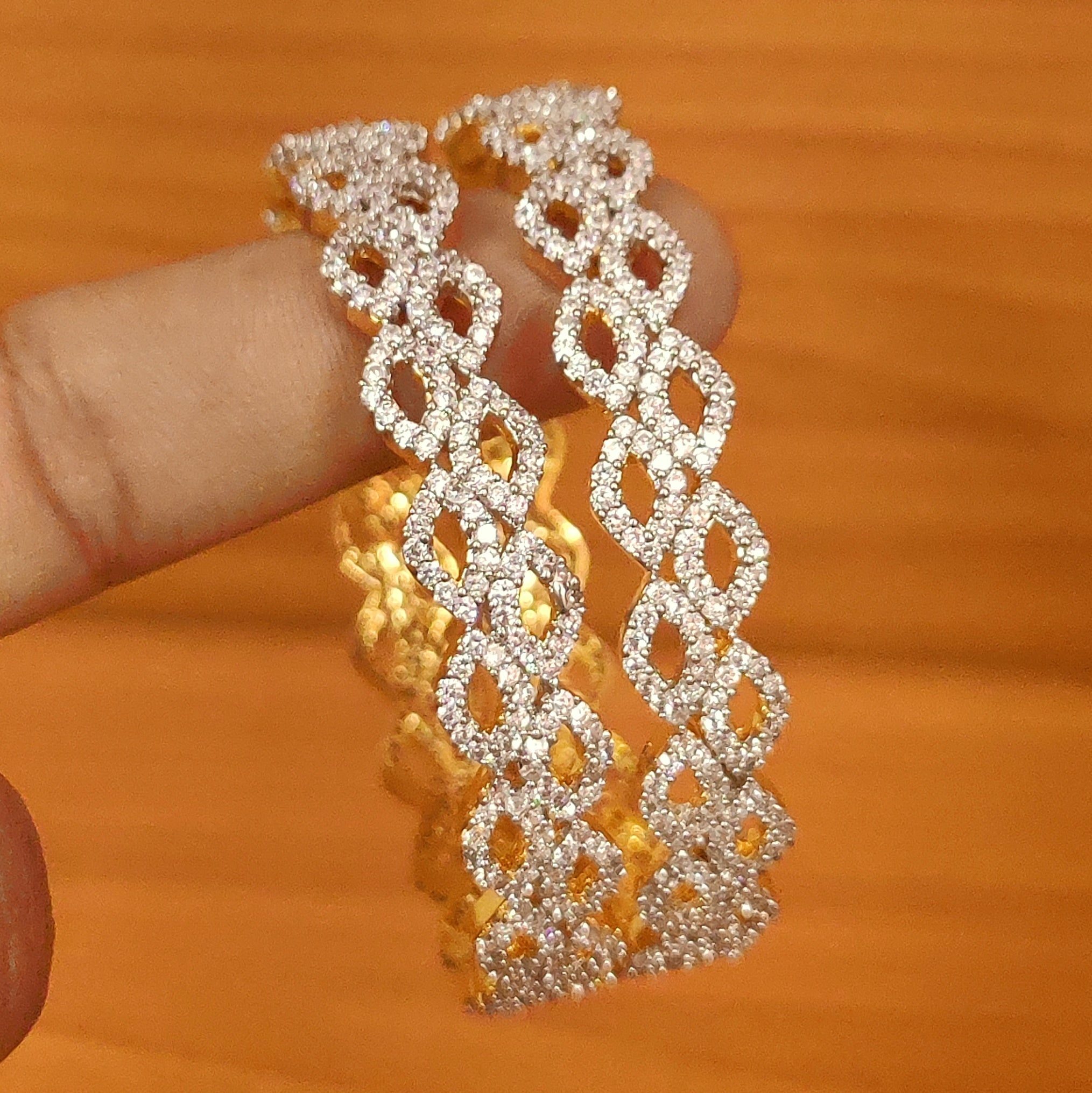 These bangles are handcrafted in silver & brass alloy with imitation cz stones of very fine quality. These artistic yet modern bangles are plated with fine nickle free gold rhodium to avoid any allergies to the skin.