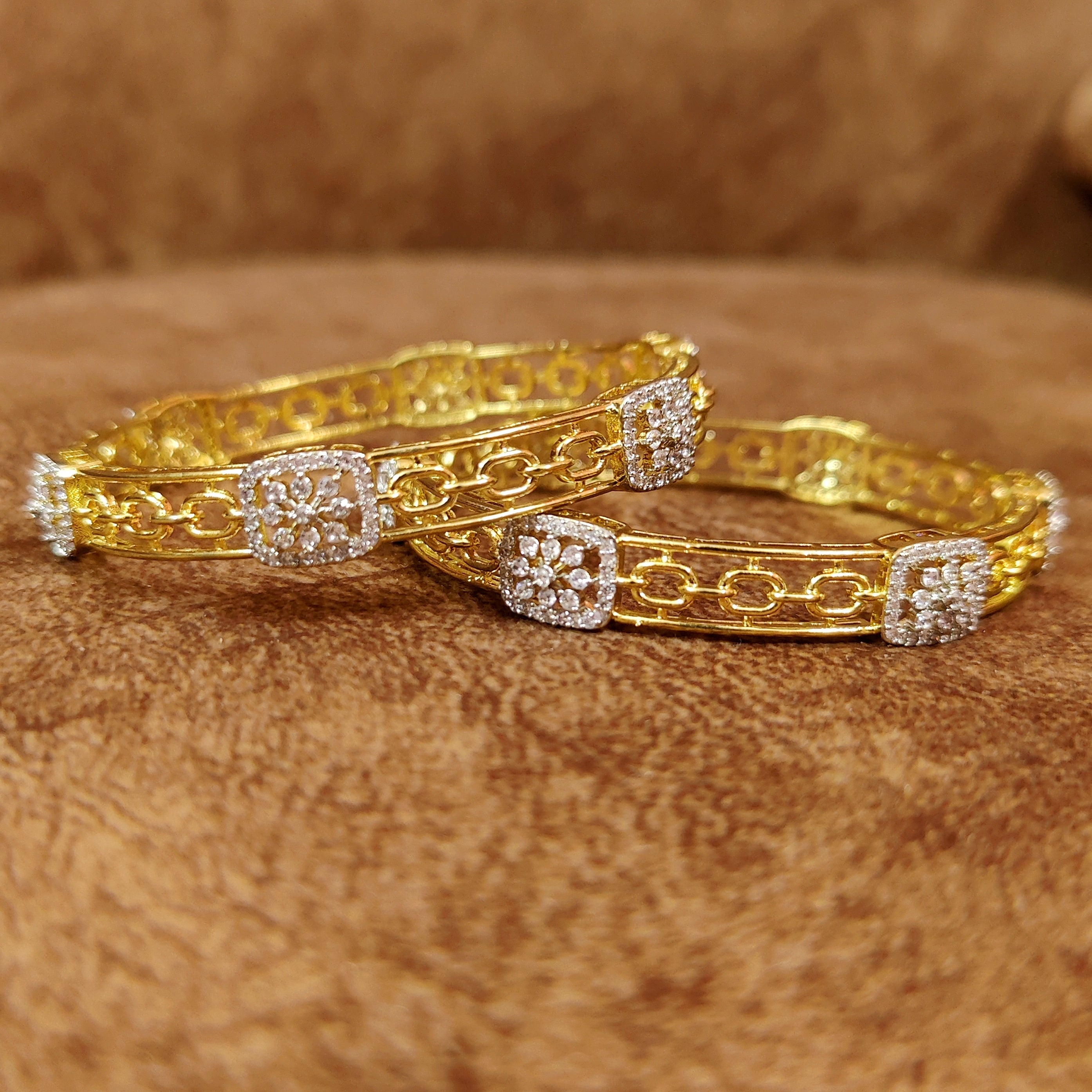 Complete your special day look with our elegant pair of gold plated diamond look alike cz bangles! These unique bangles add a touch of luxury to any occasion or party. Made with 18kt gold plating, they are perfect for weddings and special days. Shine bright with our stunning diamond look bangles!