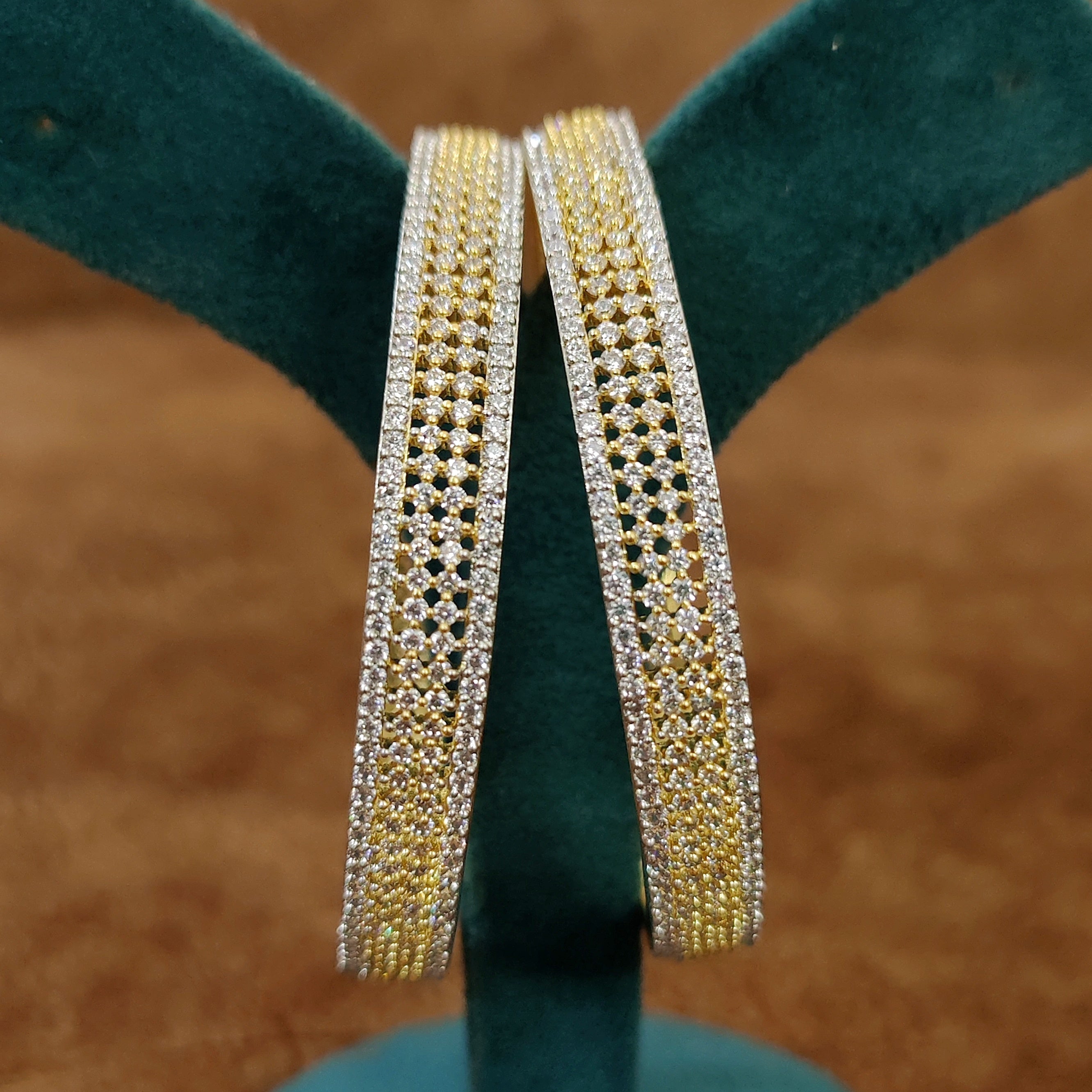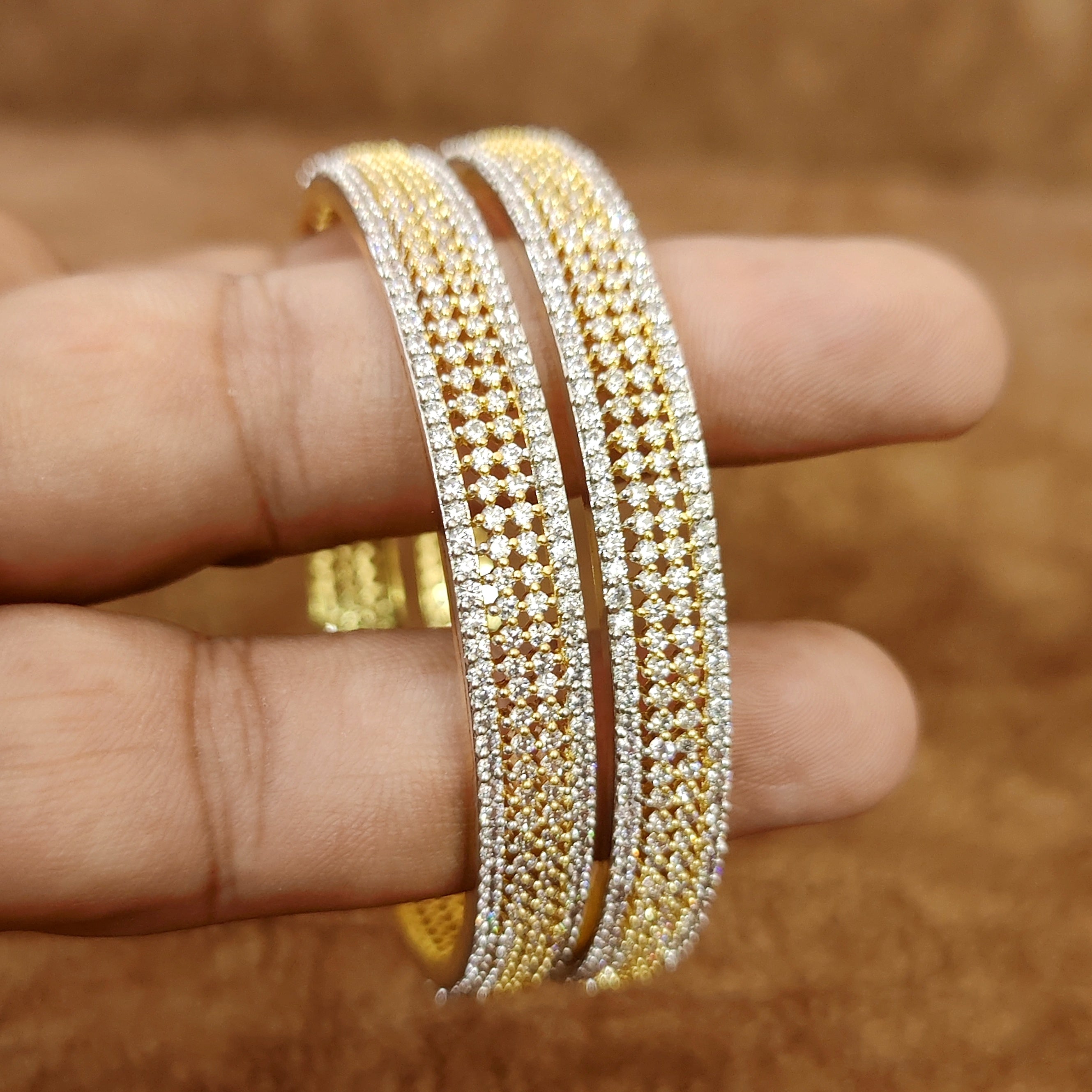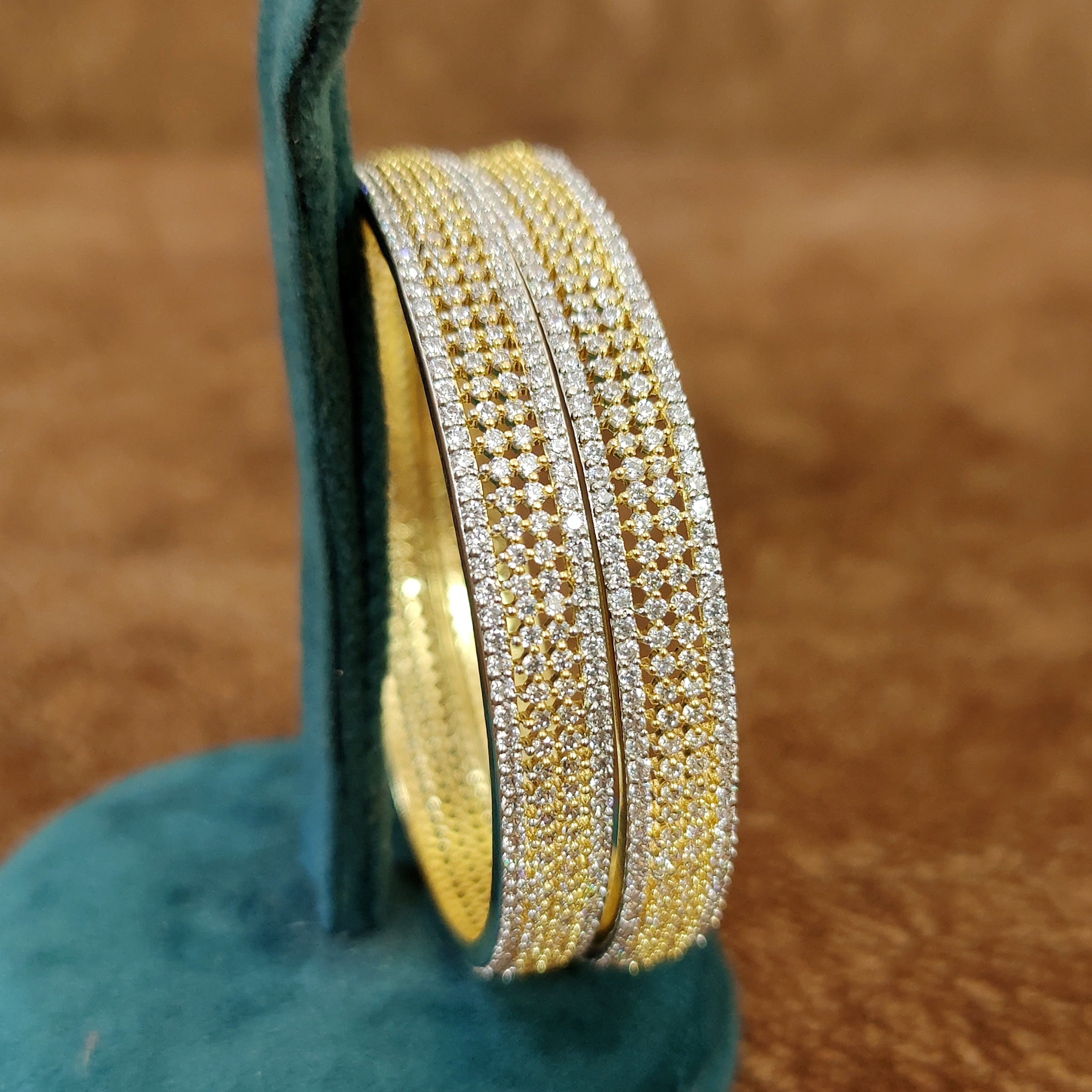 Add a touch of timeless elegance to your jewelry collection with the Diamond Pattern Gold-Plated CZ Bangles. Featuring a captivating diamond-inspired pattern adorned with sparkling cubic zirconia stones, these bangles are plated in a lustrous gold finish for a luxurious appeal. Perfect for weddings, festive occasions, or formal events, these bangles effortlessly complement traditional and contemporary outfits alike.