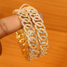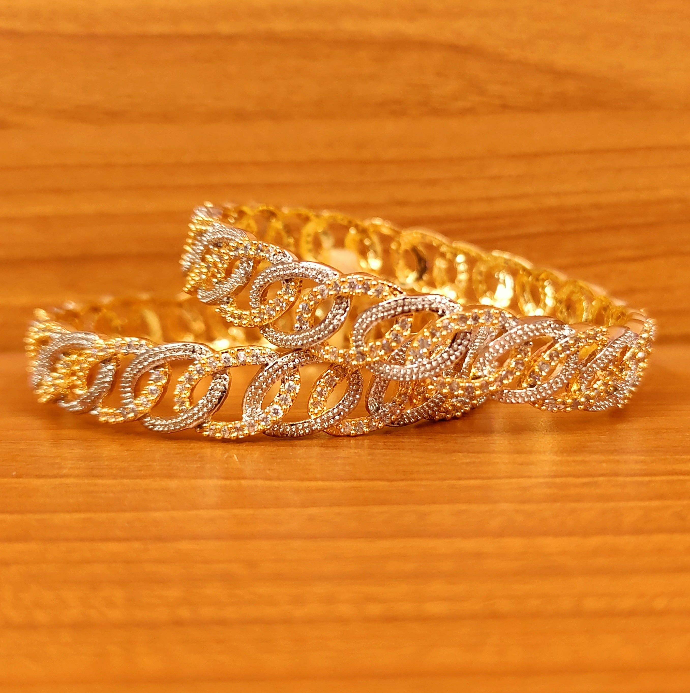 These bangles are handcrafted in silver & brass alloy with imitation cz stones of very fine quality. These artistic yet modern bangles are plated with fine nickle free gold rhodium to avoid any allergies to the skin.