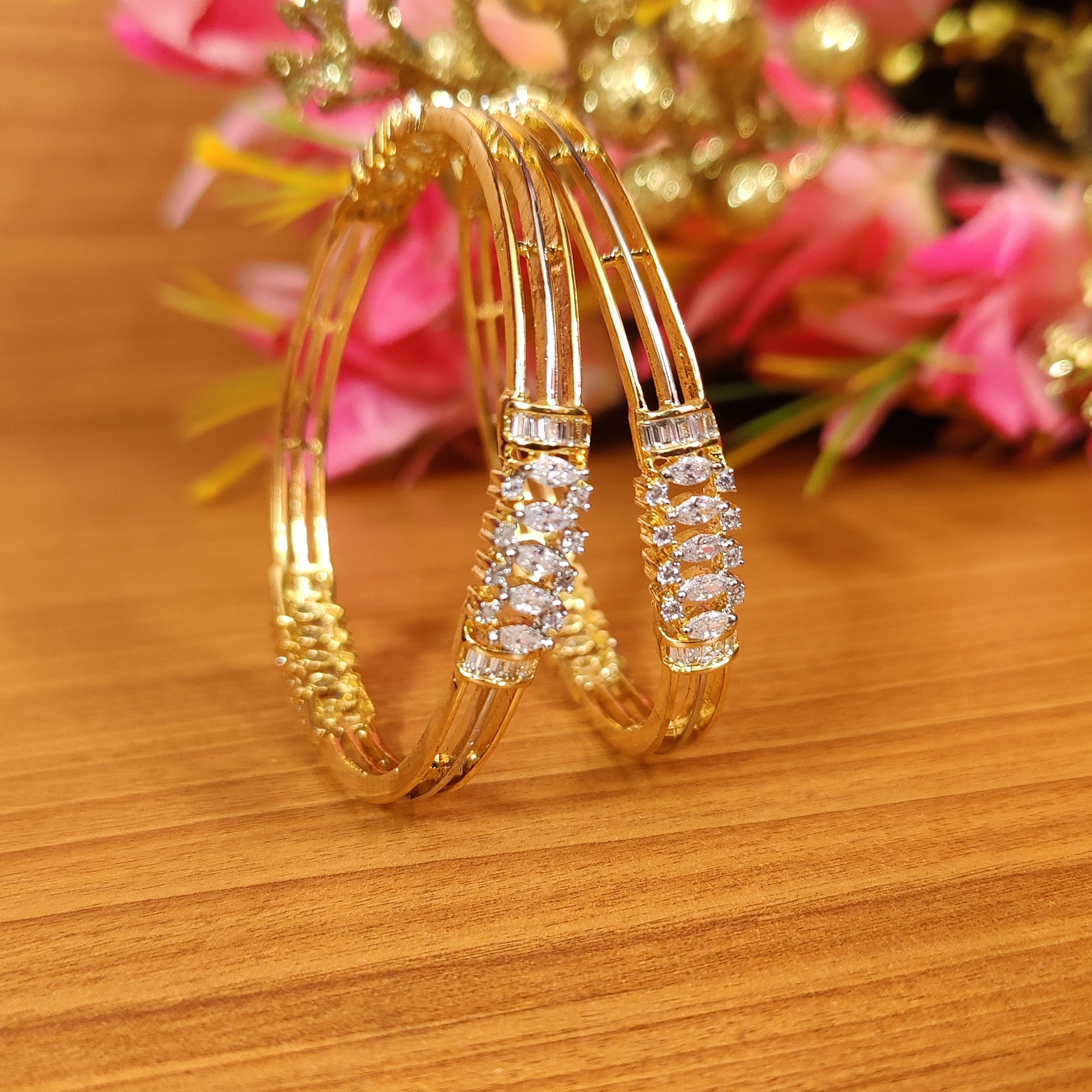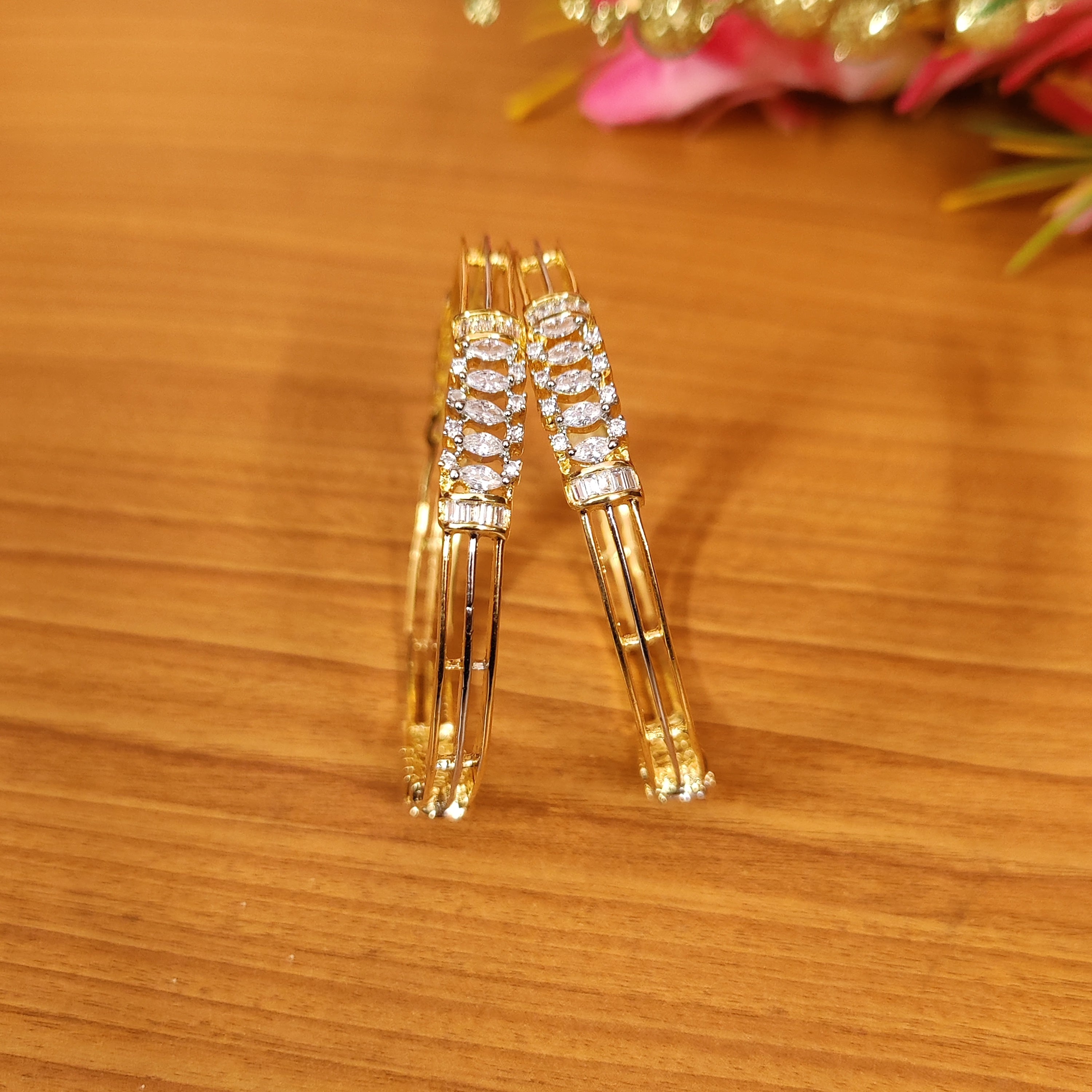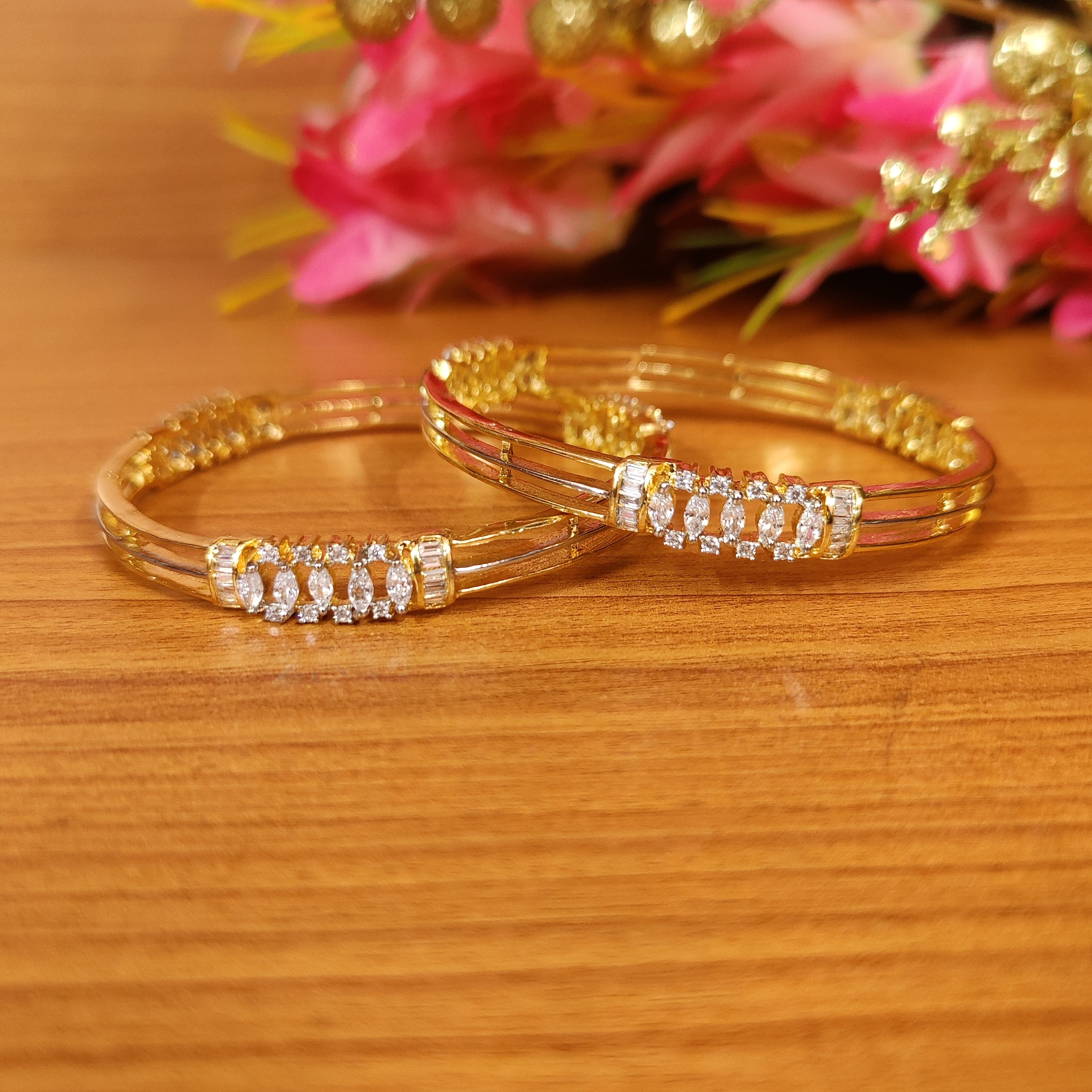 Experience the luxurious look and feel of our handcrafted brass alloy bangles adorned with sparkling cz stones and delicate gold carvings. Each bangle is plated with 18 Kt gold plating, bringing the design to life. This set of 2 bangles exudes pure elegance and sophistication.