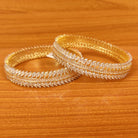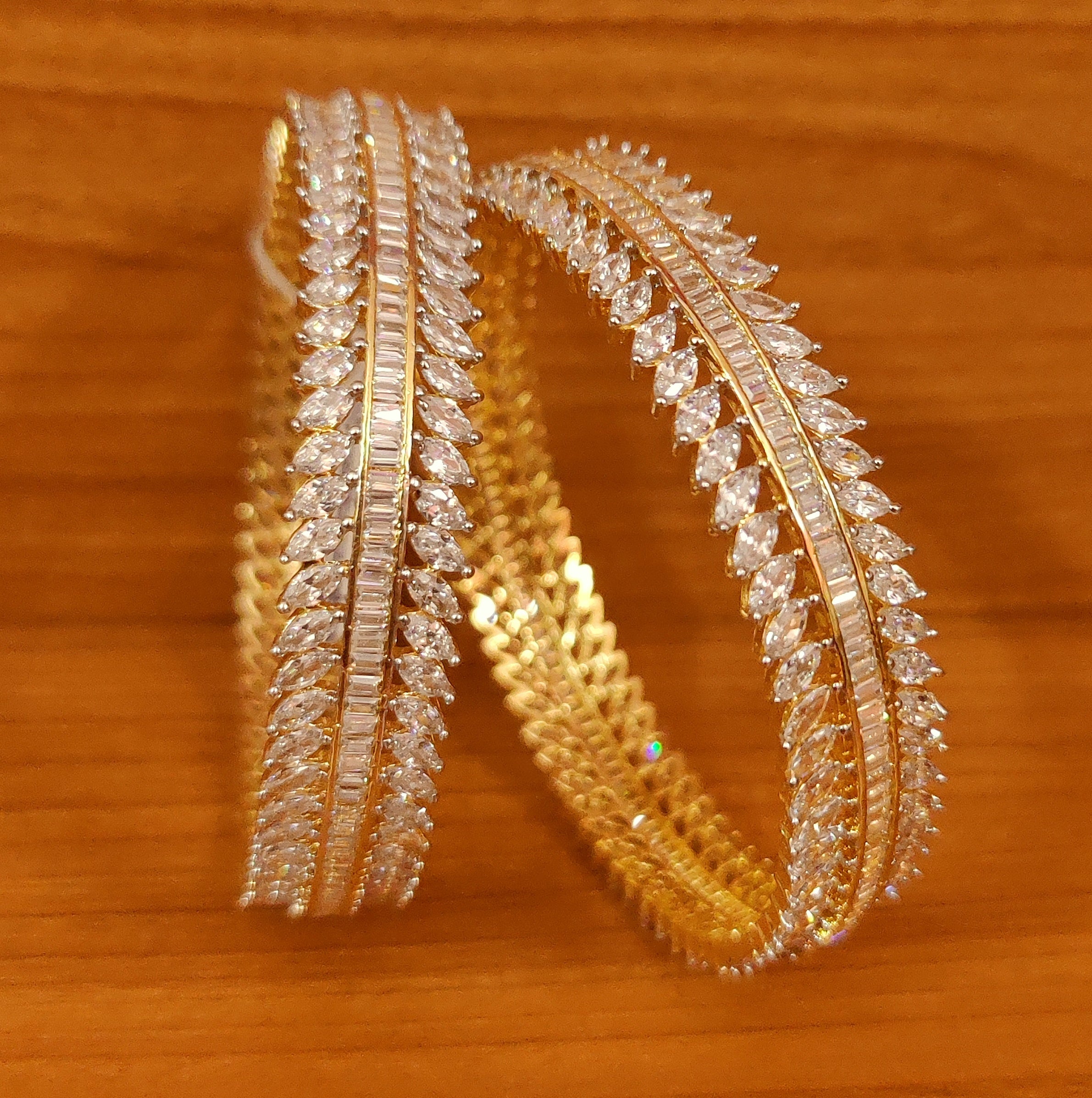 These bangles are handcrafted in silver & brass alloy with imitation cz stones of very fine quality. These artistic yet modern bangles are plated with fine nickle free gold rhodium to avoid any allergies to the skin.