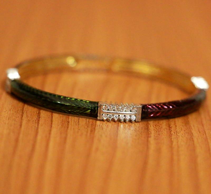 This bangle is handcrafted in silver & brass alloy with imitation cz stone of very fine quality. This artistic yet modern bangle is plated with fine nickle free gold rhodium to avoid any allergies to the skin.