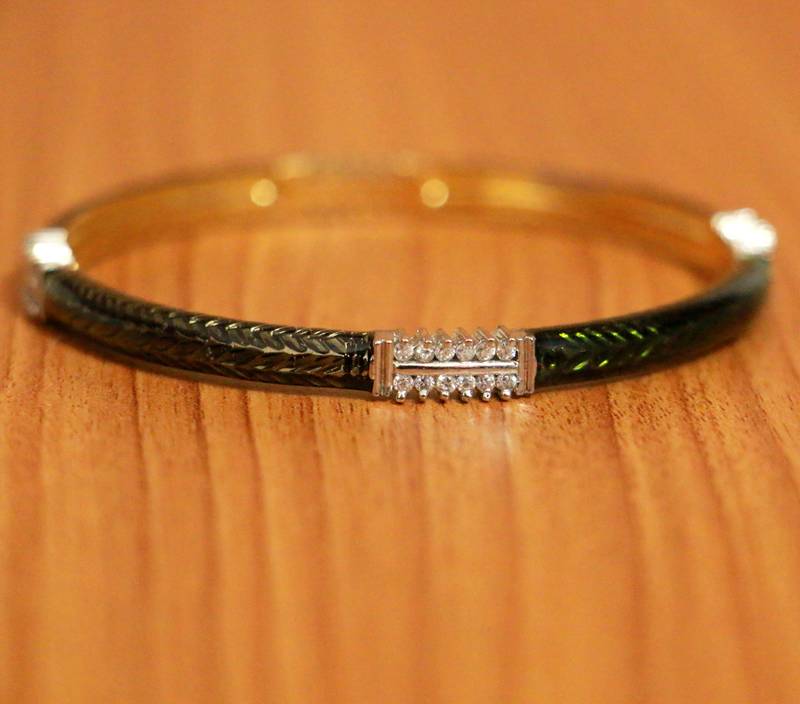 This bangle is handcrafted in silver & brass alloy with imitation cz stone of very fine quality. This artistic yet modern bangle is plated with fine nickle free gold rhodium to avoid any allergies to the skin.