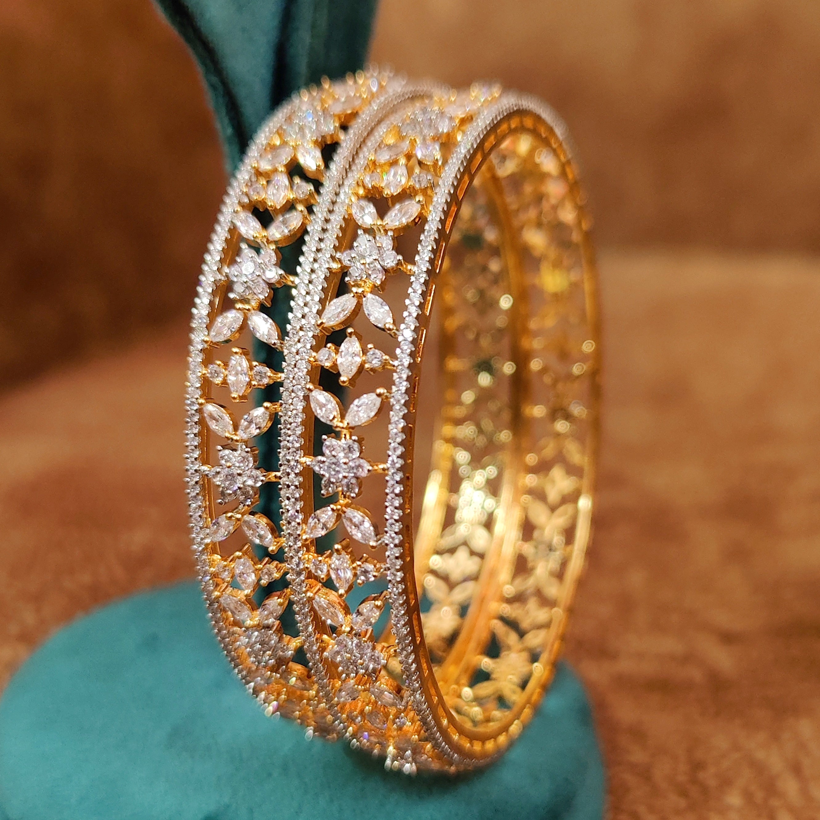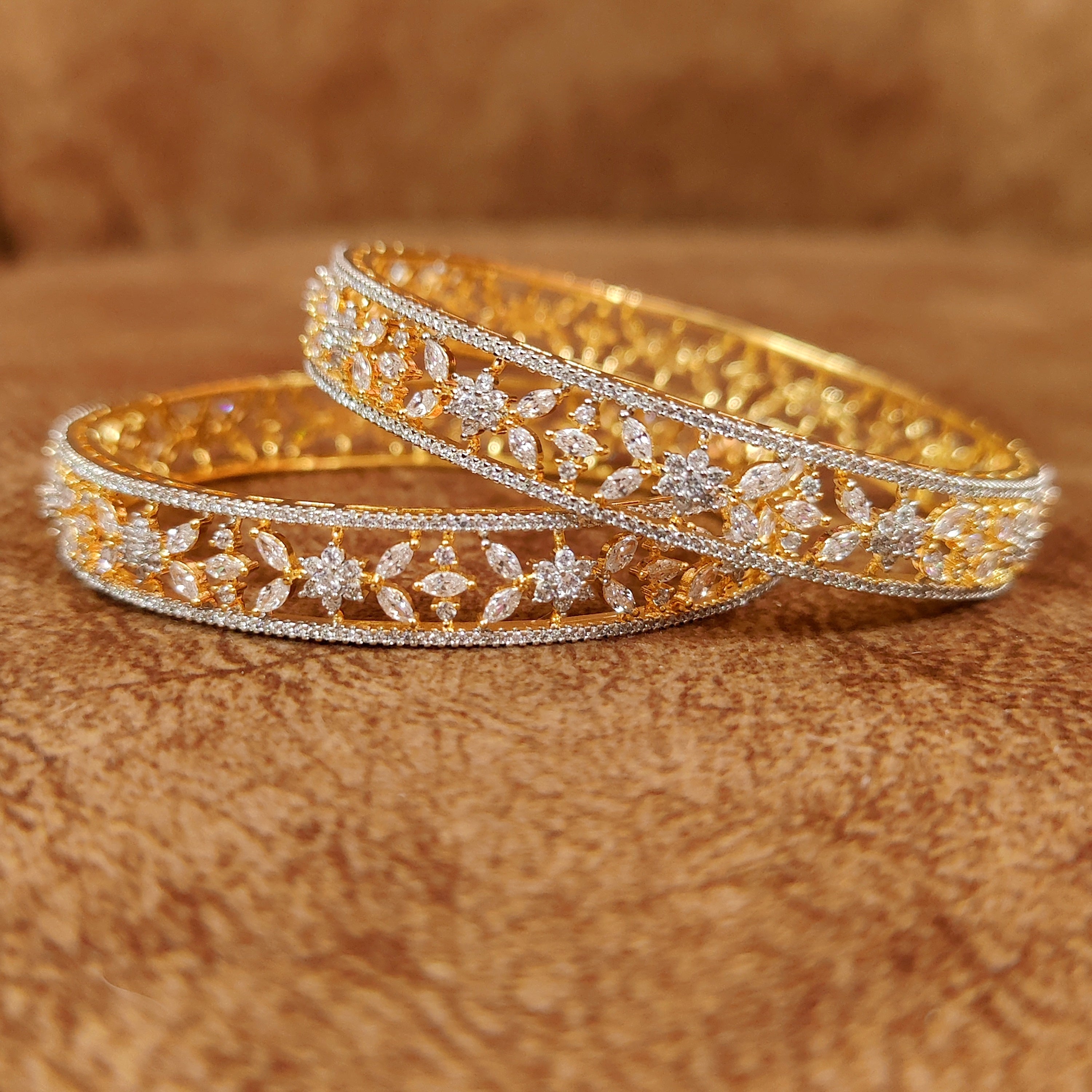Elevate your style with the Real Diamond Pattern Gold Plated CZ Bangles from Sanvi Jewels. These exquisite bangles feature a luxurious diamond-inspired pattern, adorned with shimmering cubic zirconia stones, all set in a lustrous gold-plated design. Ideal for weddings, special occasions, or adding a touch of glamour to everyday looks, these bangles offer timeless elegance and unmatched sophistication.