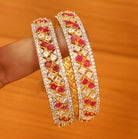 These bangles are handcrafted in silver & brass alloy with imitation red ruby & cz stones of very fine quality. These artistic yet modern bangles are plated with fine nickle free gold rhodium to avoid any allergies to the skin.