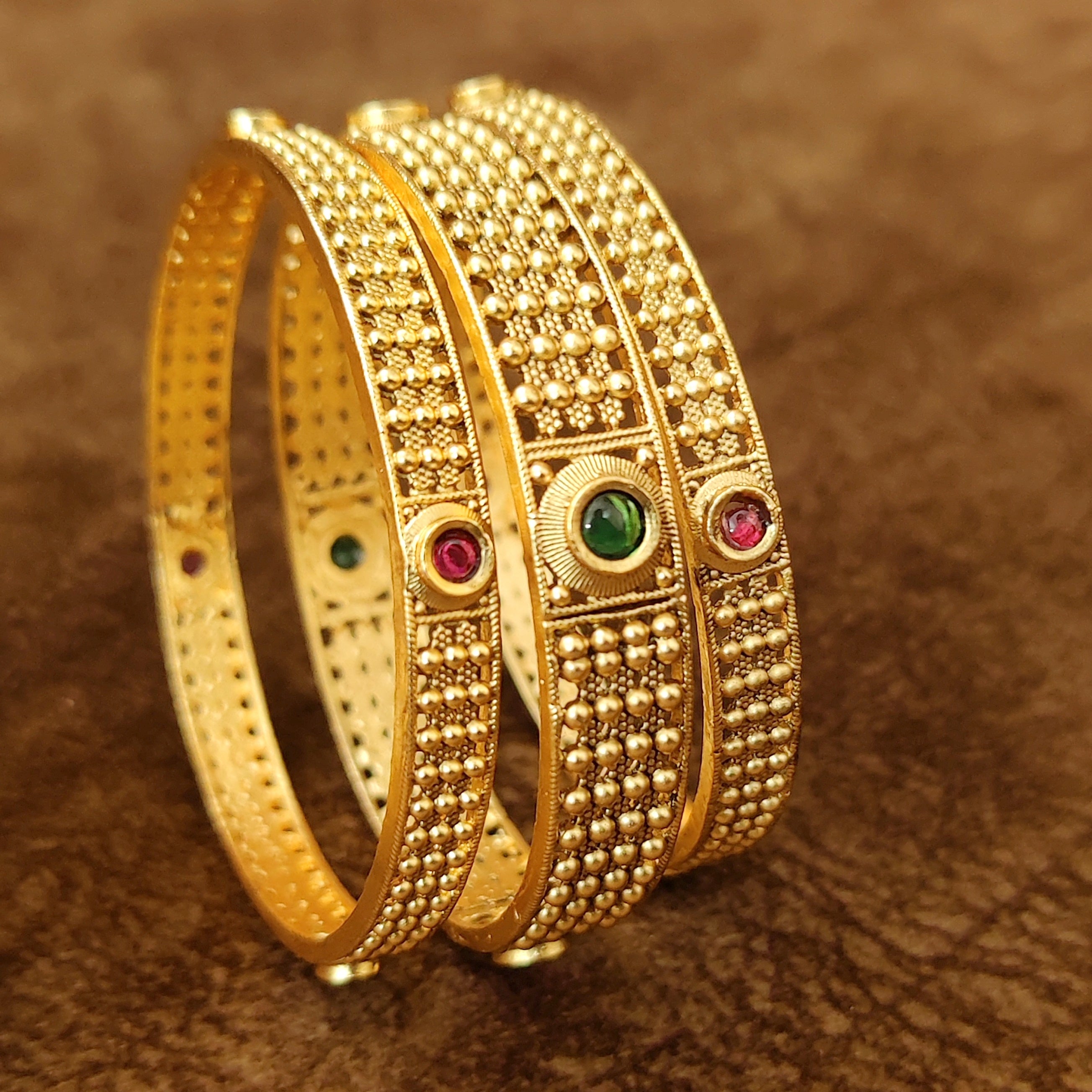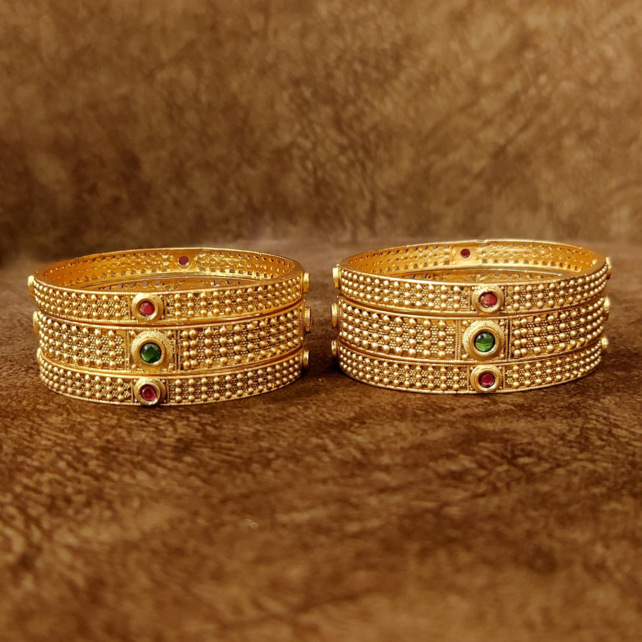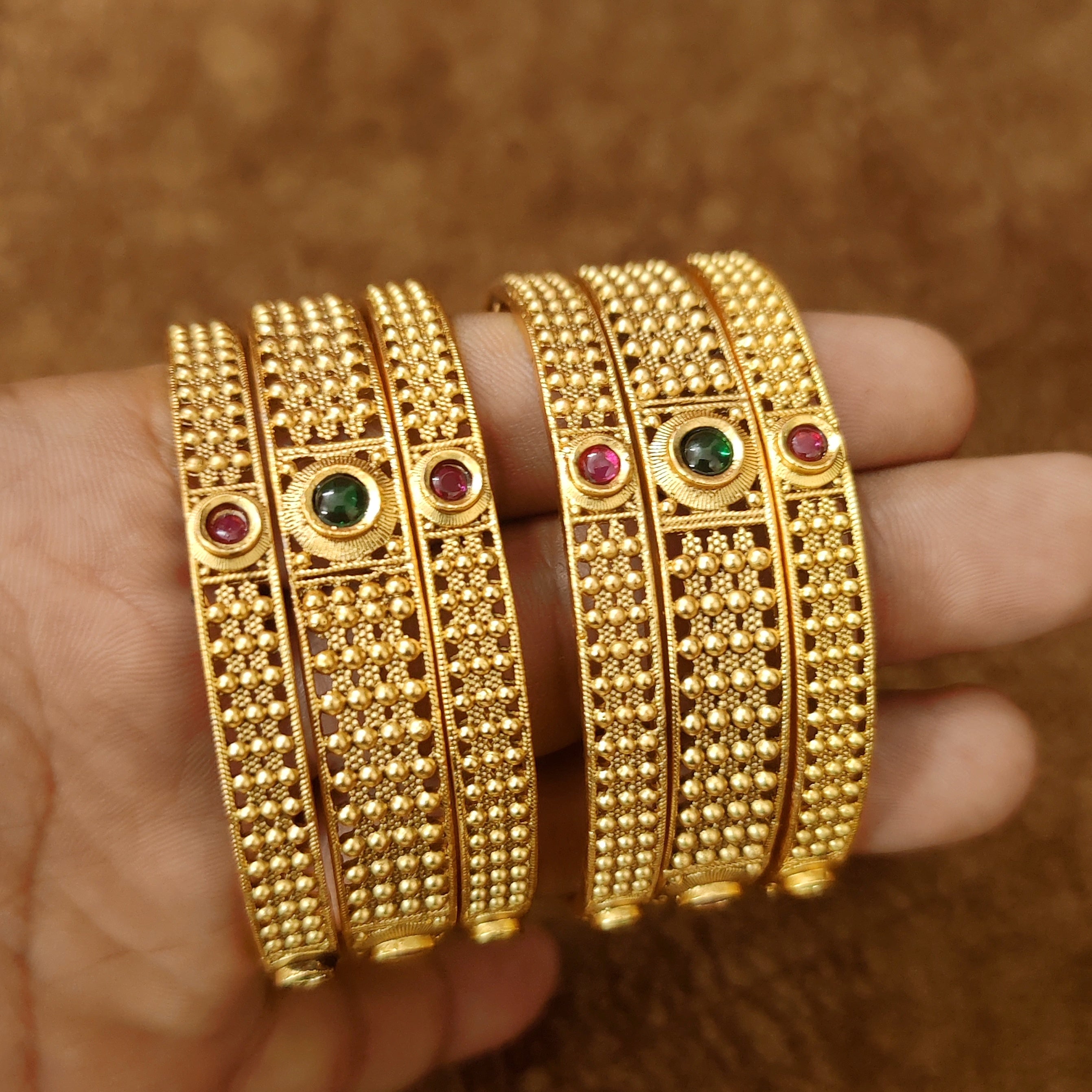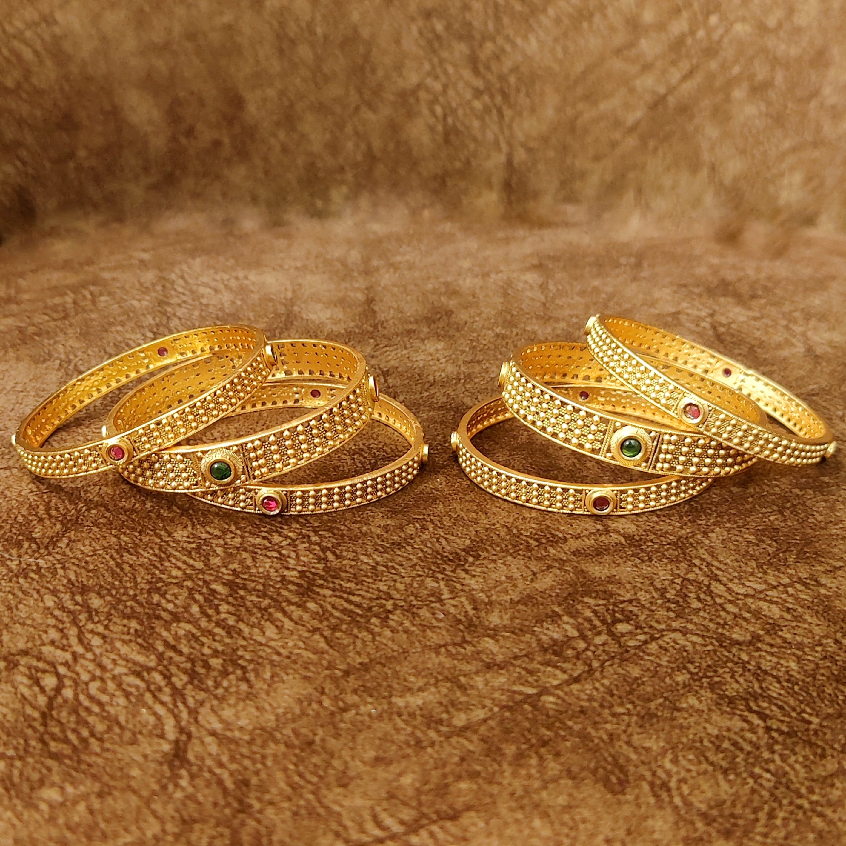 Elevate your ethnic charm with the Antique Gold Plated Multicolour Set of 6 Bangles, a perfect blend of traditional artistry and vibrant elegance. These finely crafted bangles showcase a stunning antique gold finish adorned with multicolored accents, making them ideal for weddings, festivals, or any special occasion. Designed to complement sarees, lehengas, and salwar suits, this set adds timeless grace to your jewelry collection.