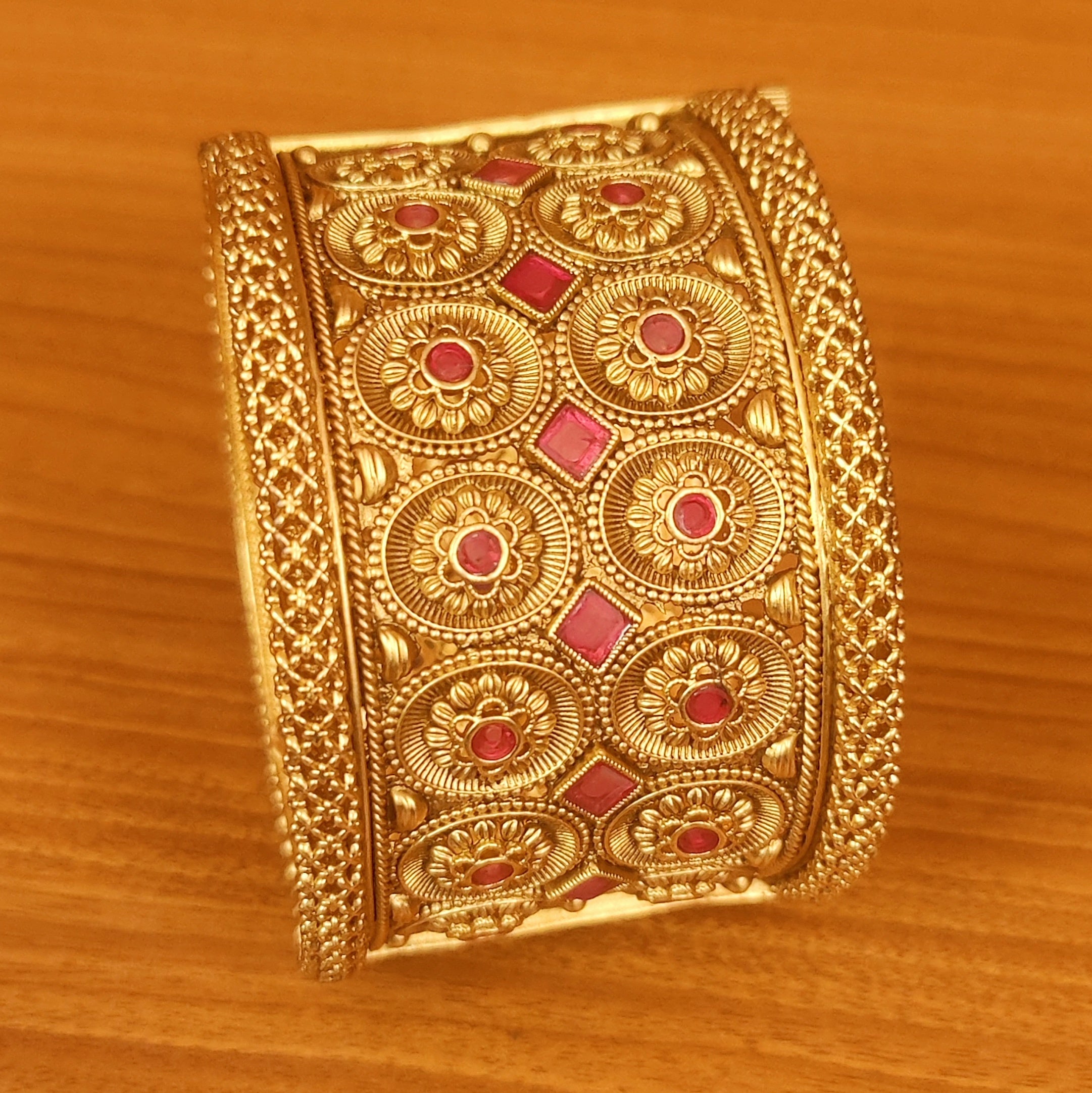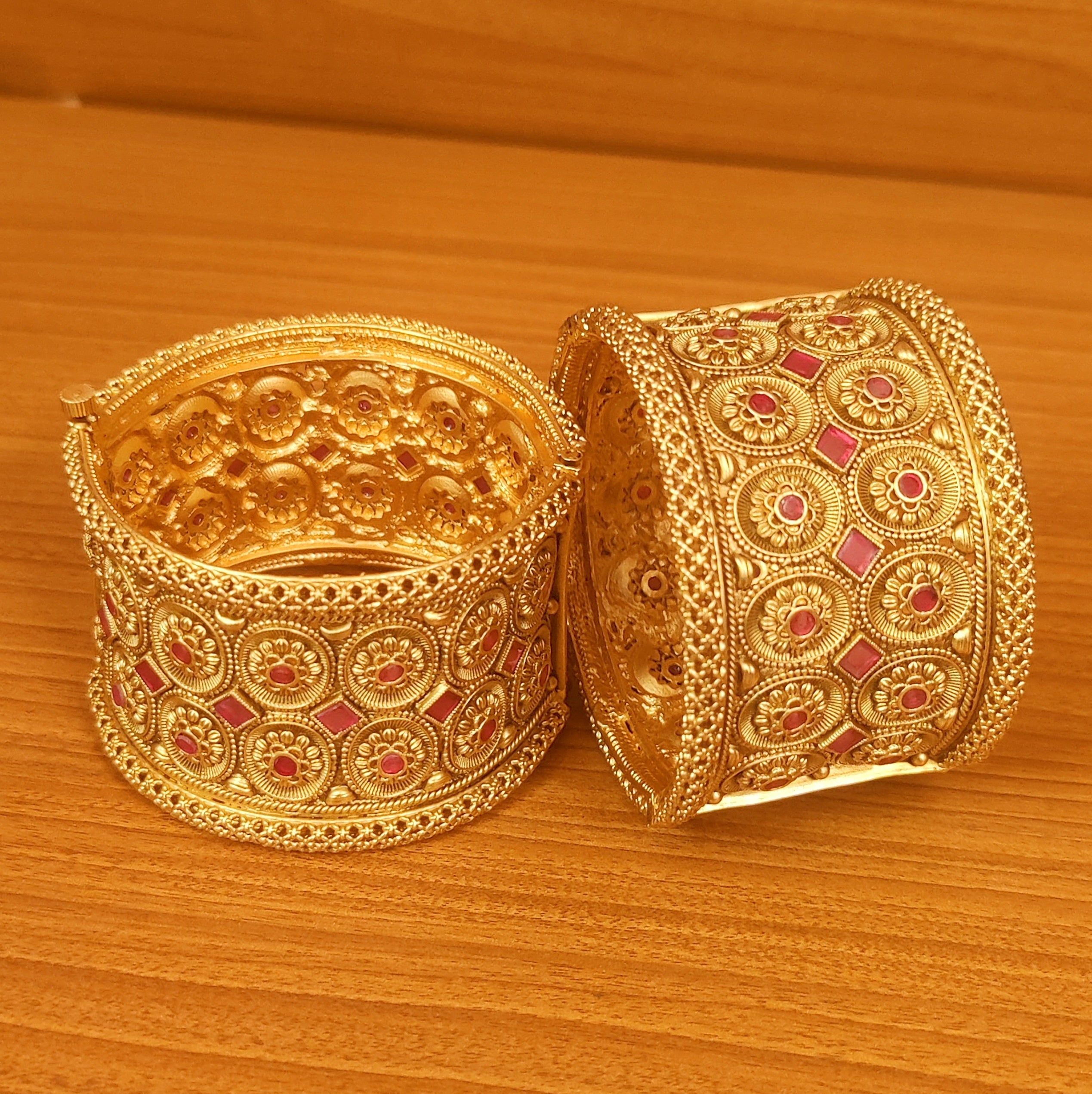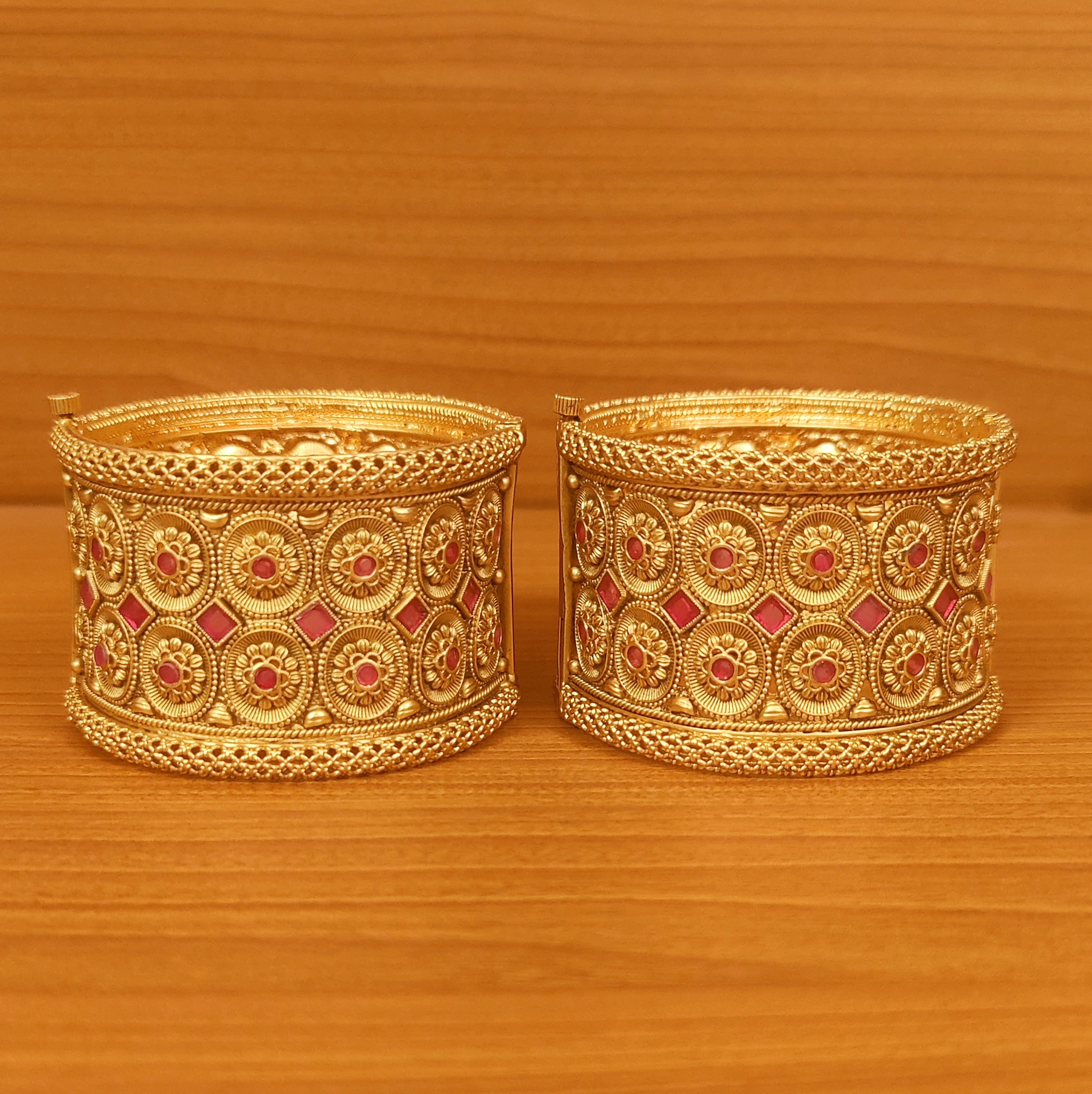 These beautiful matt gold bangles are handcrafted in copper alloy with imitation ruby colour stone with hand graved carving work of very fine quality. These bangles are coated with 18 kt matt gold rajwadi plating that gives a real look to the design, these bangles comes with a pair and are openable which means if you are selecting 2.4 size, it can fit both 2.4 size and 2.6 size.