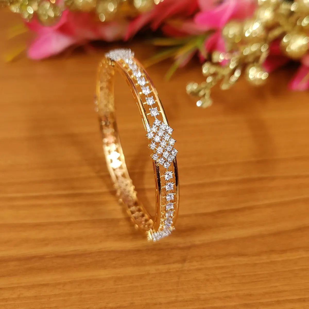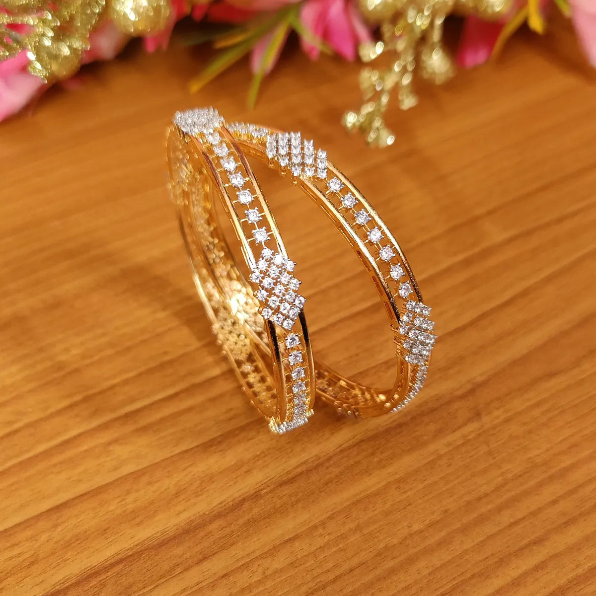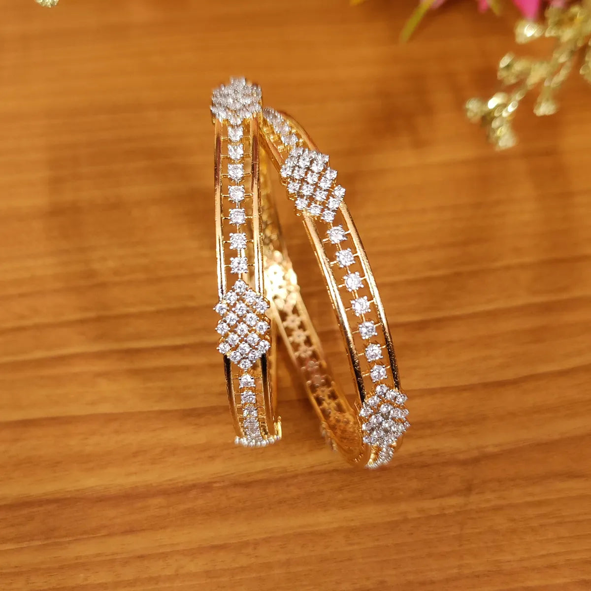 Indulge in the luxurious look of real diamonds with these exquisitely handcrafted brass alloy bangles adorned with high-quality American diamond stones. Each set contains 2 bangles coated in 18 Kt gold plating for an authentic shine. Experience the weightlessness and expert craftsmanship that will make you believe you are wearing the real thing.