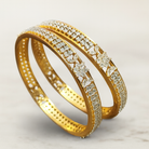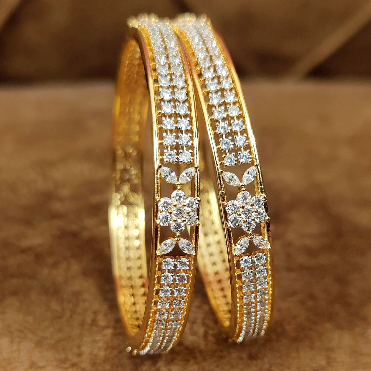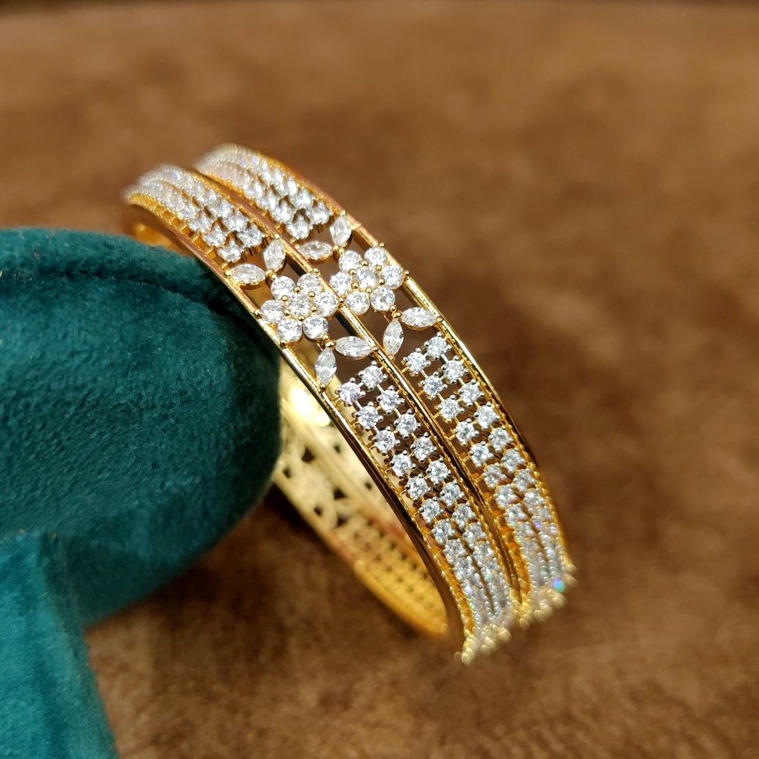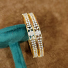 Add a touch of sparkle to your festive and bridal look with our Floral Shine Gold Plated CZ Stone Bangles from Sanvi Jewels. These stunning bangles are crafted with 22kt gold plating and embellished with sparkling cubic zirconia stones, arranged in a graceful floral motif.