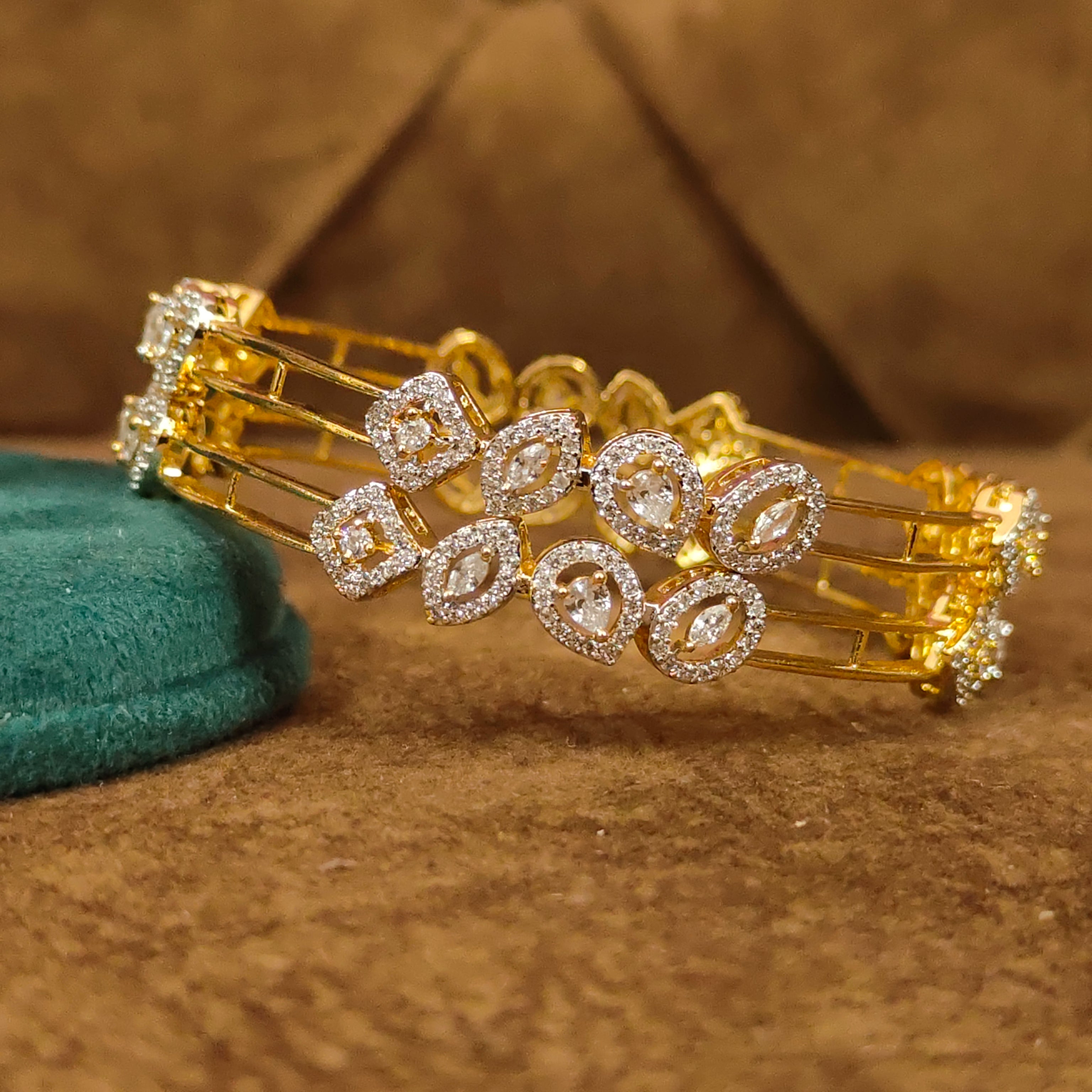 Enhance your elegance with our Royal Grace Gold Plated AD Stone Bangles, exclusively crafted by Sanvi Jewels. These bangles feature a delicate trio-band design adorned with marquise and square CZ stones, giving them a luxurious diamond-like sparkle.