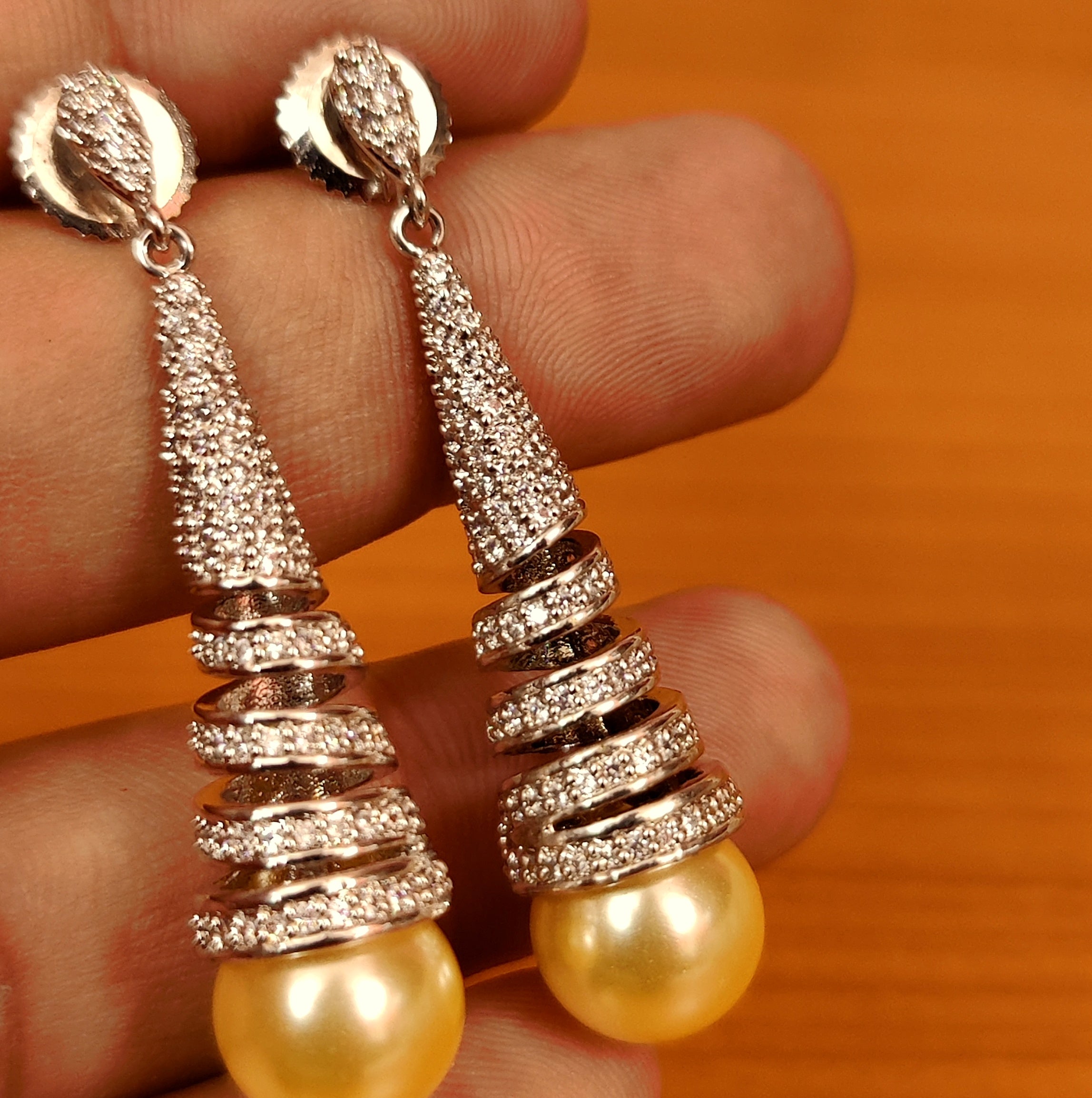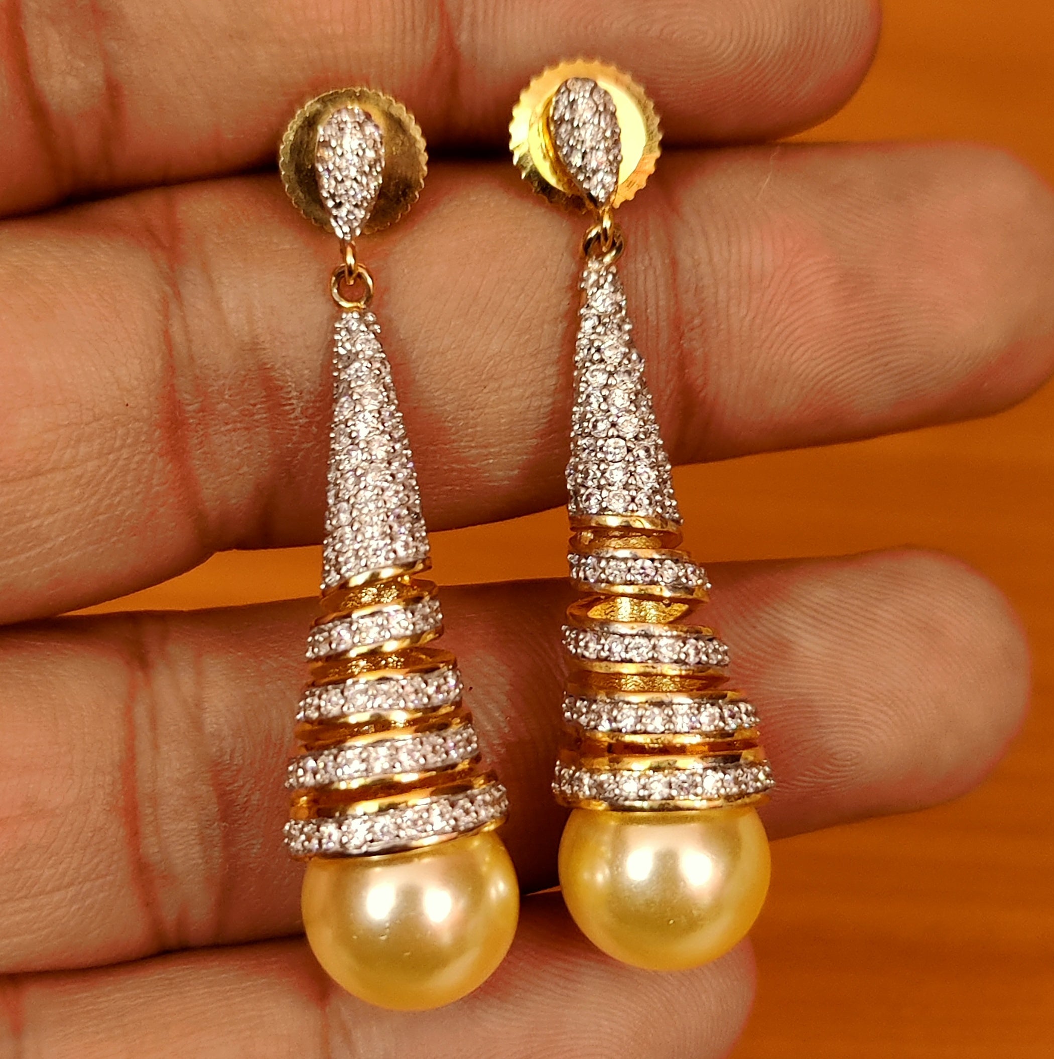 These diamond look earrings are handcrafted in silver and brass alloy with imitation american diamonds and pearls of very fine quality. These medium sized party wear danglers are crafted with fine finishihng and plated with real 18kt fine nickel free gold rhodium that gives a real diamond look to the design.