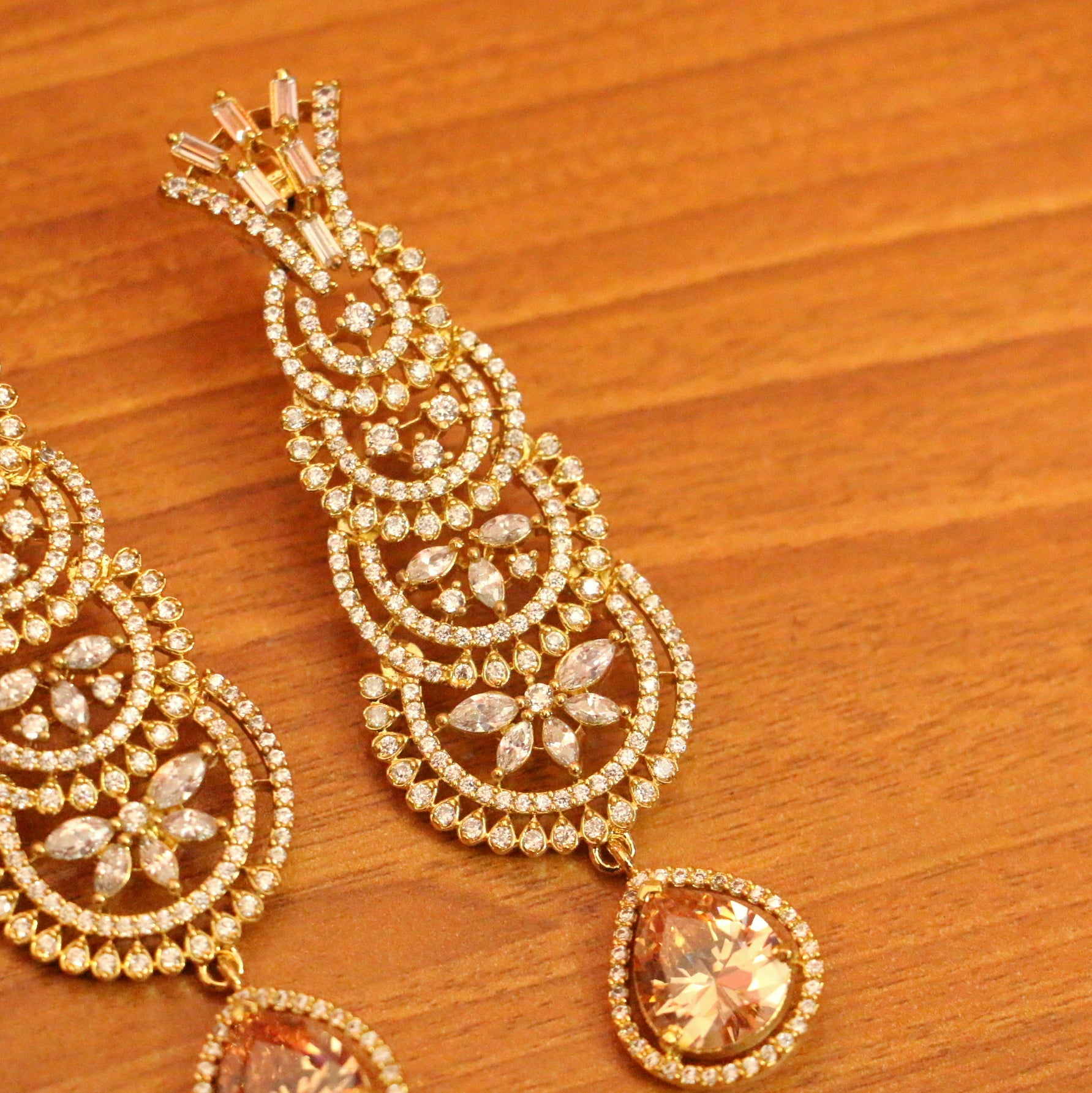 These earrings are handcrafted in silver alloy with imitation yellow citrine & american diamond work of very fine quality. These artistic yet modern earrings are plated with high quality 18kt gold rhodium. The earrings are very light in weight.