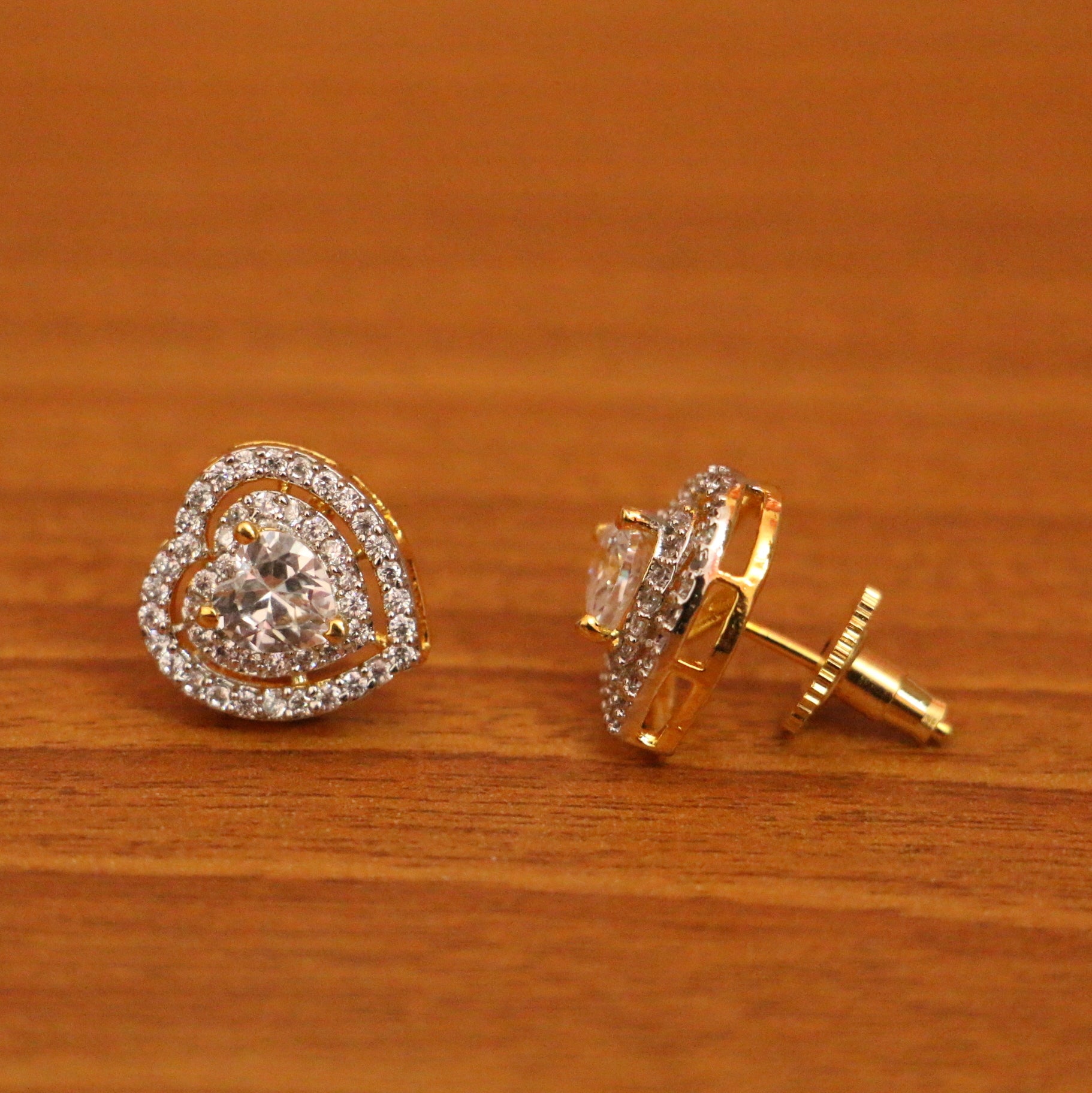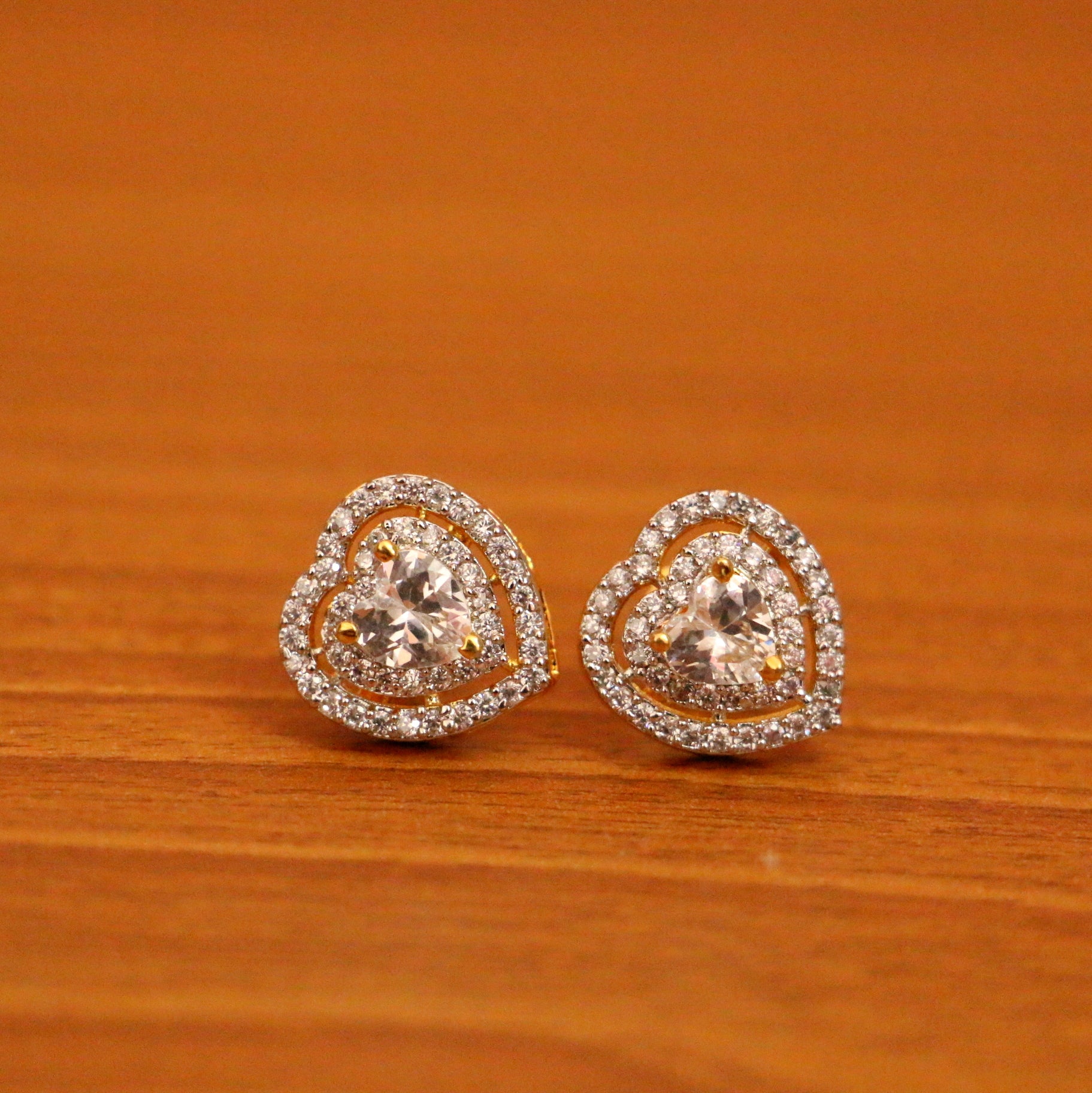 These heart pattern diamond look studs are handcrafted in silver alloy with imitation cz stones of very fine quality. These earrings are plated in 18kt gold rhodiumplating which gives the design a real gold look .