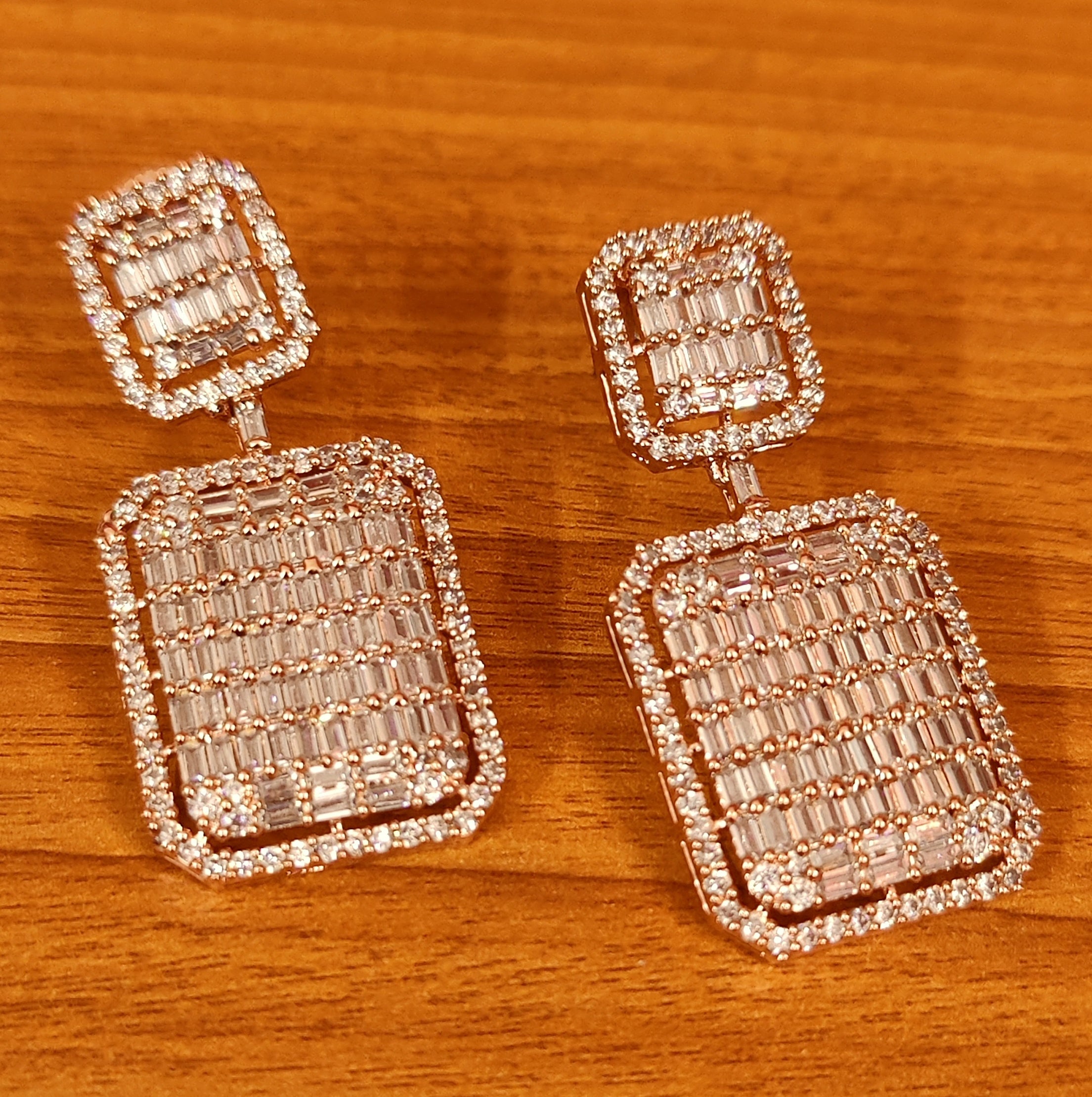 These diamond look earrings are handcrafted in silver alloy with imitation cz signity stones which are of the finest quality of american diamond stones . These party wear earrings are handcrafted with cz signity stones to perfection with fine setting and plated with real 18kt fine nickel rose gold rhodium that gives a real diamond look to the design.