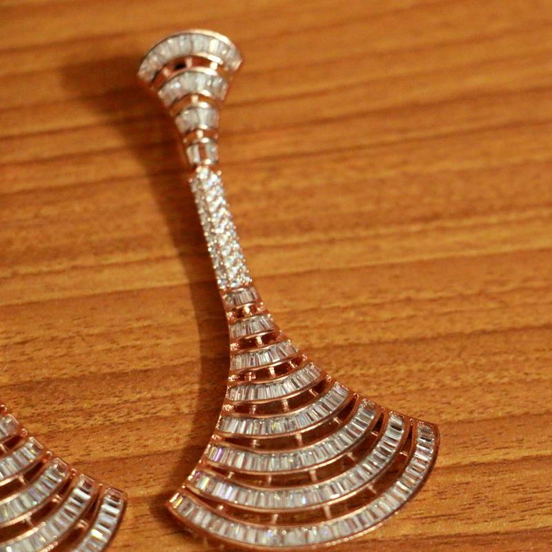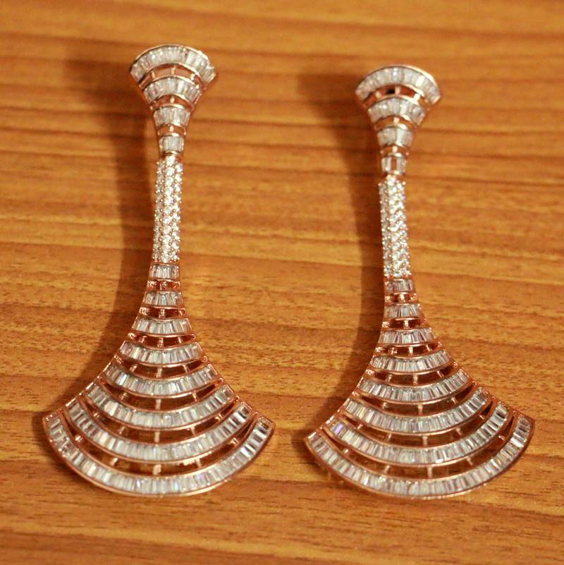 These diamond look danglers are handcrafted in silver alloy with imitation cz stones of very fine quality. These earrings are plated in 18kt rose gold rhodium plating that gives you a perfect look to your party dress.