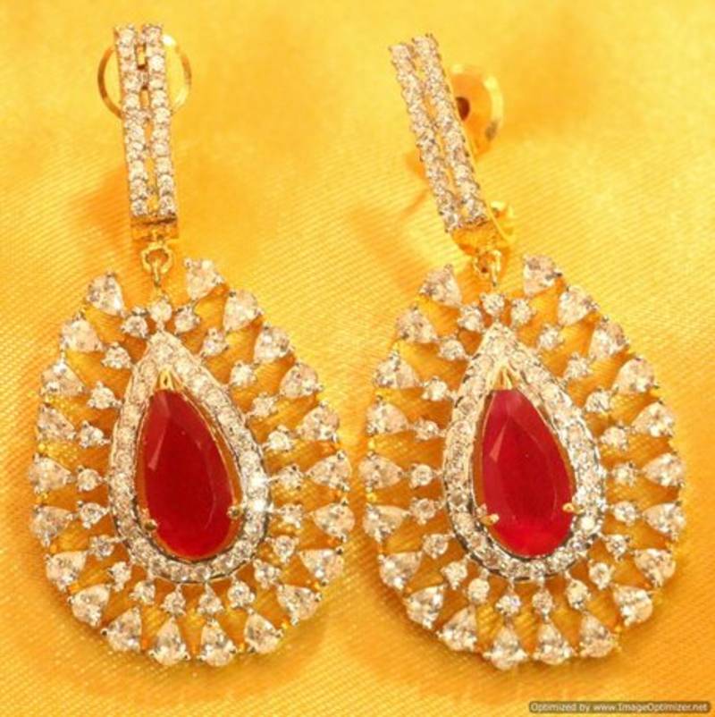 These diamond look danglers are handcrafted in silver alloy with imitation ruby colour quartz & cz stones of very fine quality. These earrings are plated in 18kt gold rhodium plating which gives the design a real jewelry look .