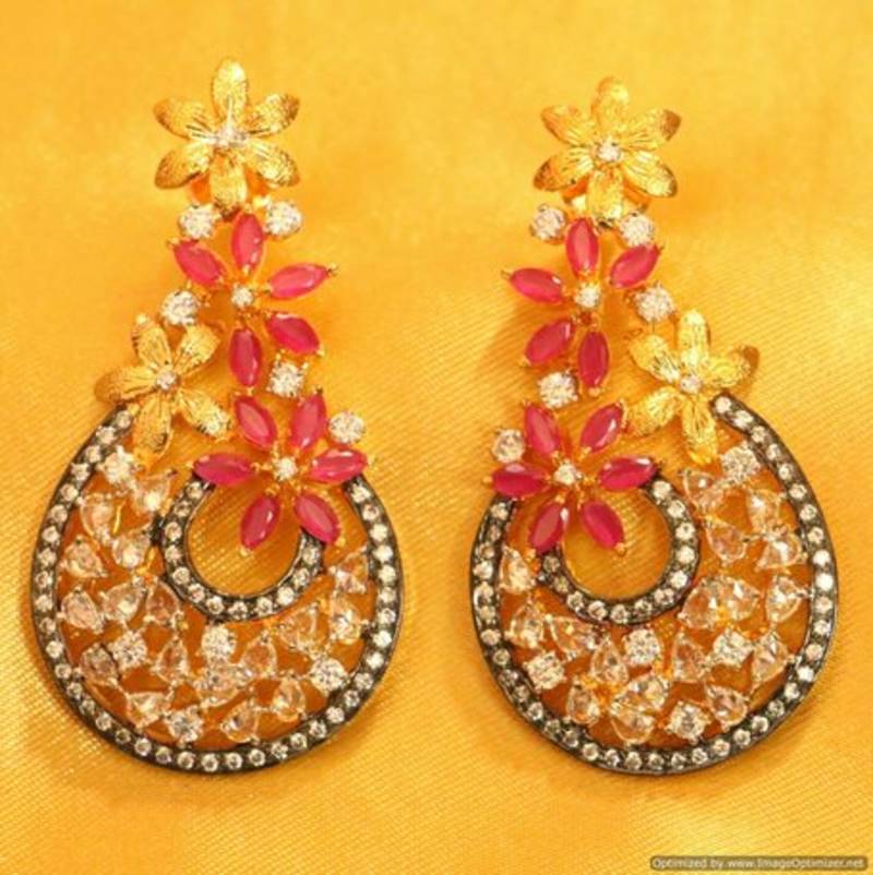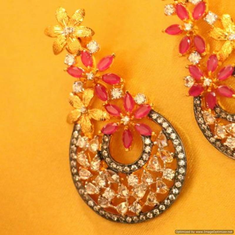 These diamond look danglers are handcrafted in silver alloy with imitation ruby colour quartz & cz stones of very fine quality. These earrings are plated in 18kt gold rhodium plating which gives the design a real jewelry look .