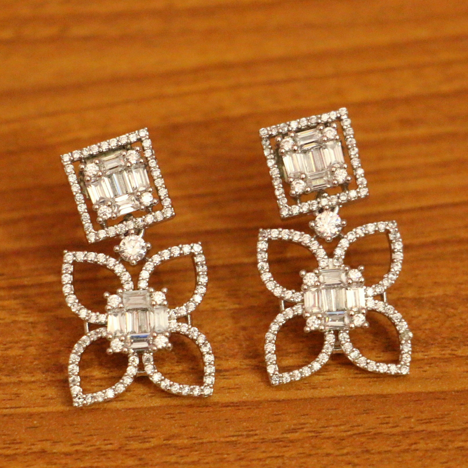 These earrings are handcrafted in silver alloy with imitation american diamond work of very fine quality. These artistic yet modern earrings are plated with high quality white gold rhodium. The earrings are very light in weight.