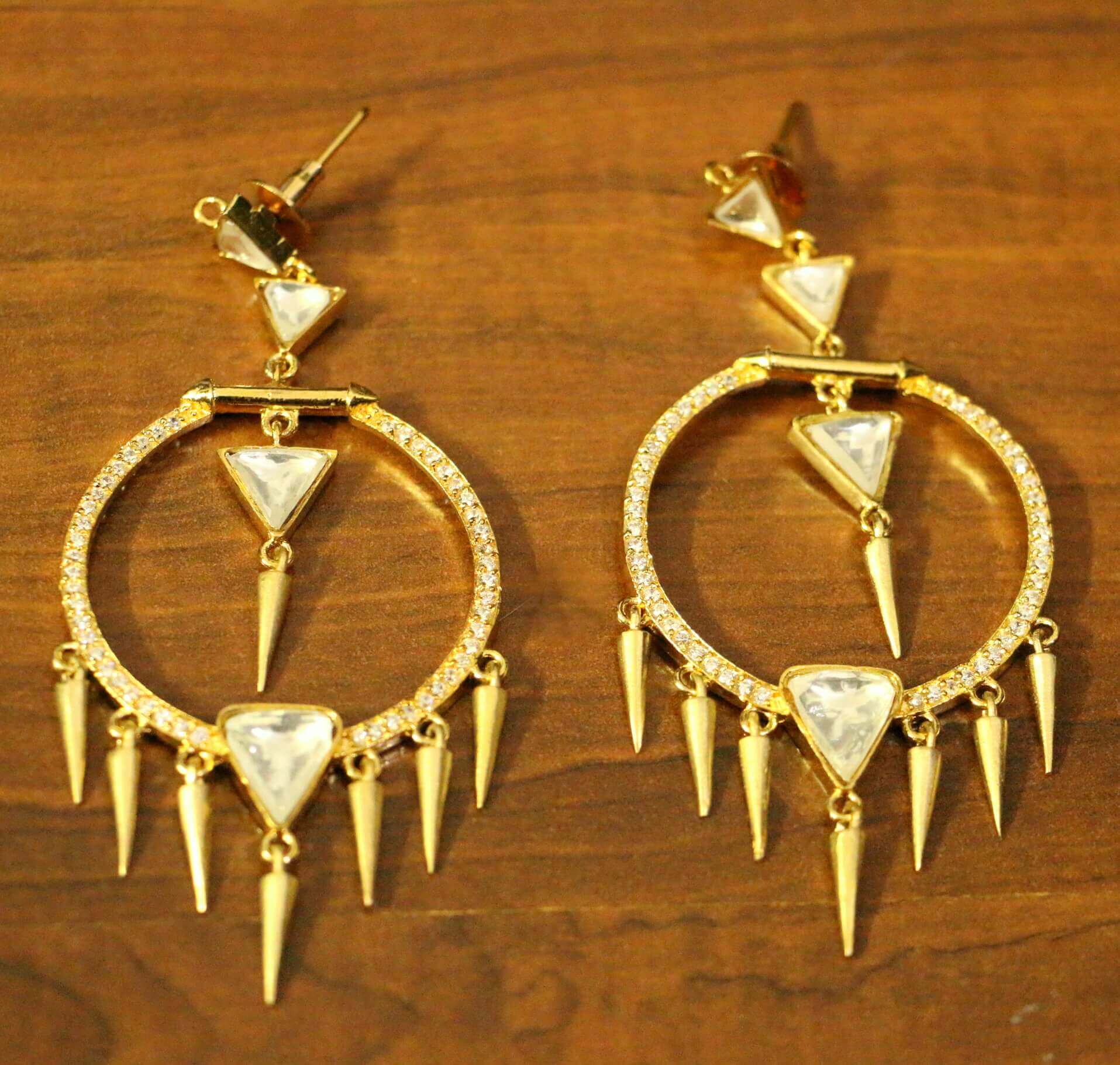 These diamond look danglers are handcrafted in silver alloy with imitation cz stones of very fine quality. These earrings are plated in 18kt gold rhodium plating which gives the design a real jewelry look .