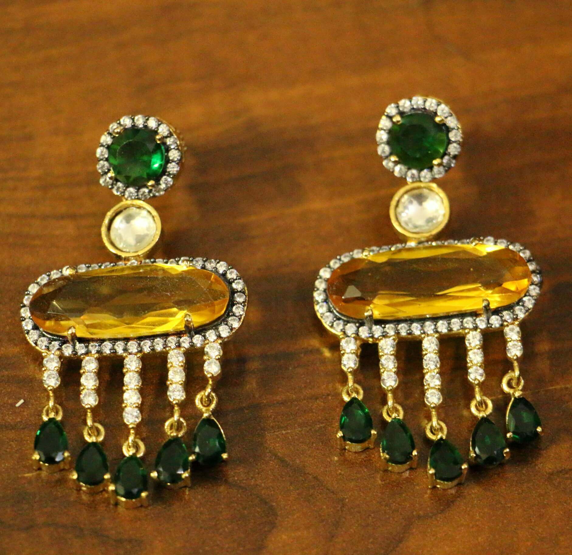These diamond look danglers are handcrafted in silver alloy with imitation yellow, green onyx colour stone & cz stones of very fine quality. These earrings are plated in 18kt gold rhodium plating which gives the design a real jewelry look .