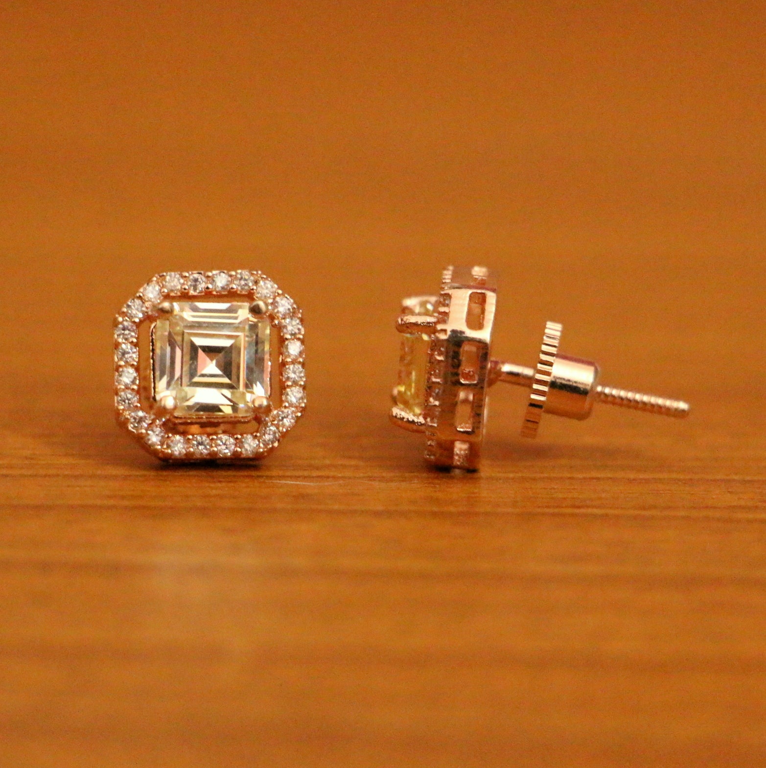 These diamond look studs are handcrafted in silver alloy with imitation sapphire colour quartz & cz stones of very fine quality. These earrings are plated in rose gold rhodium plating which gives the design a real jewelry look .