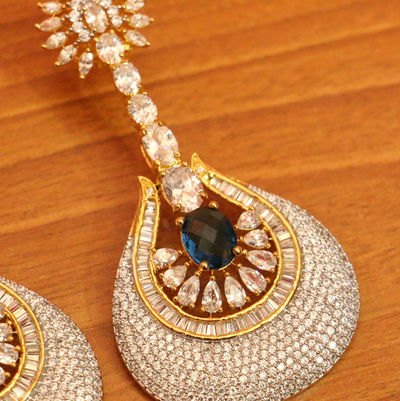 GOLD DIAMOND LOOK BLUE SAPPRIE DANGLERS