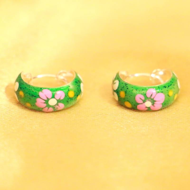 92.5 Sterling Silver Green Flower Pattern Earrings
