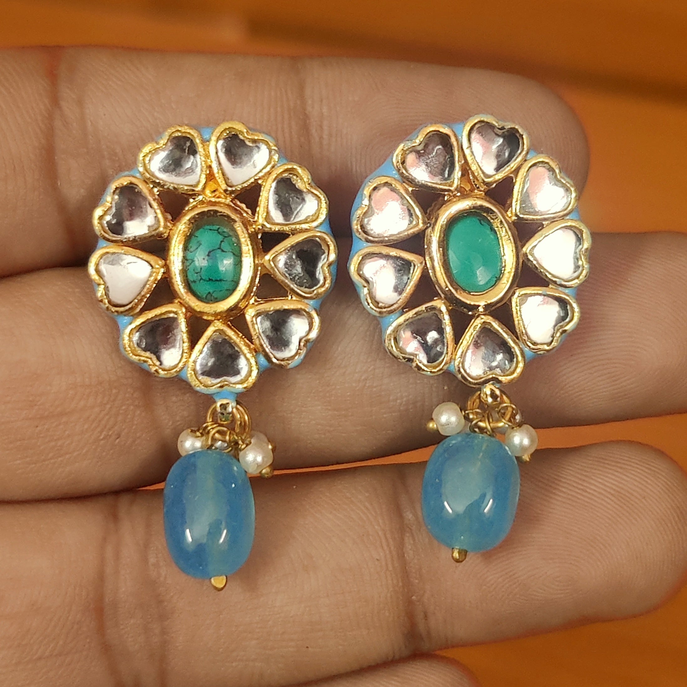 BLUE STONE KUNDAN SETTING MEENAKARI BEADS DANGLING STUDS
