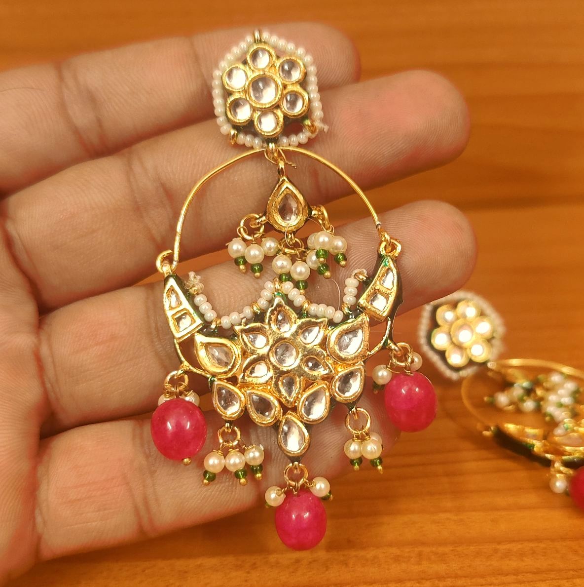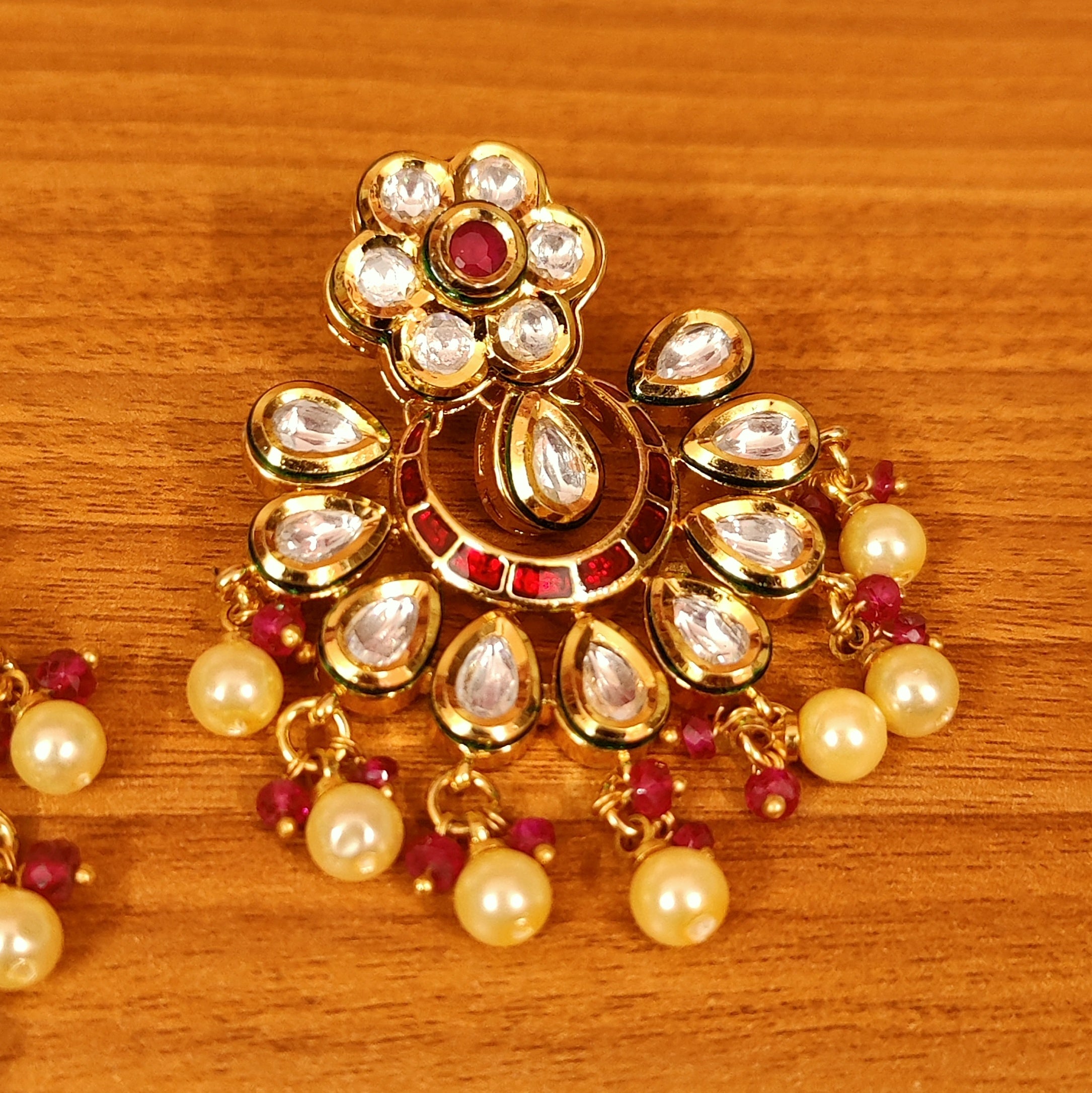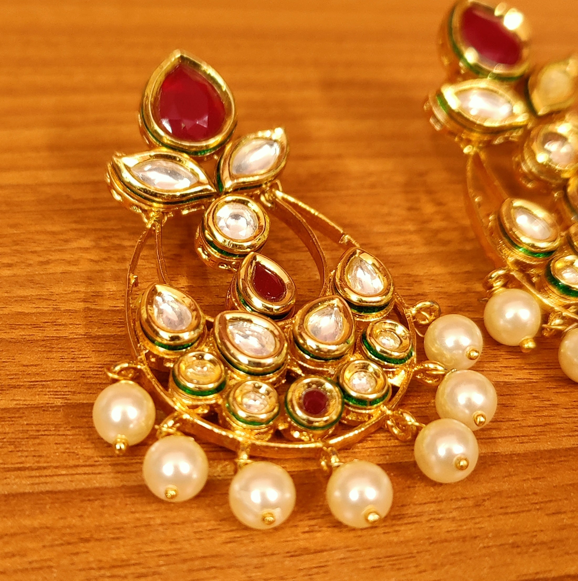 RUBY KUNDAN POLKI & CZ STUDDED PEARL CHANDBALI