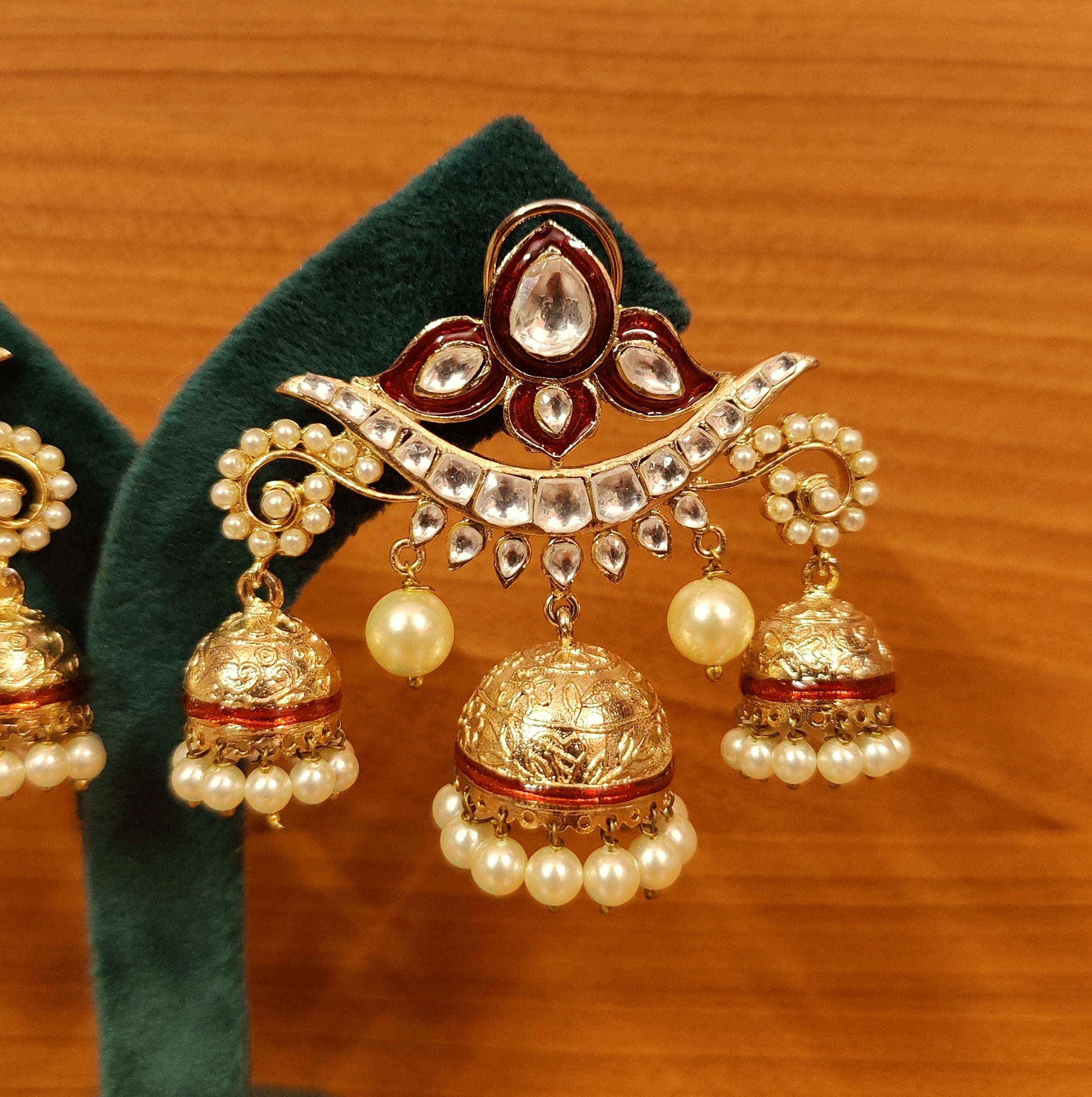 RUBY KUNDAN POLKI GOLD PLATED PEARL JHUMKAS