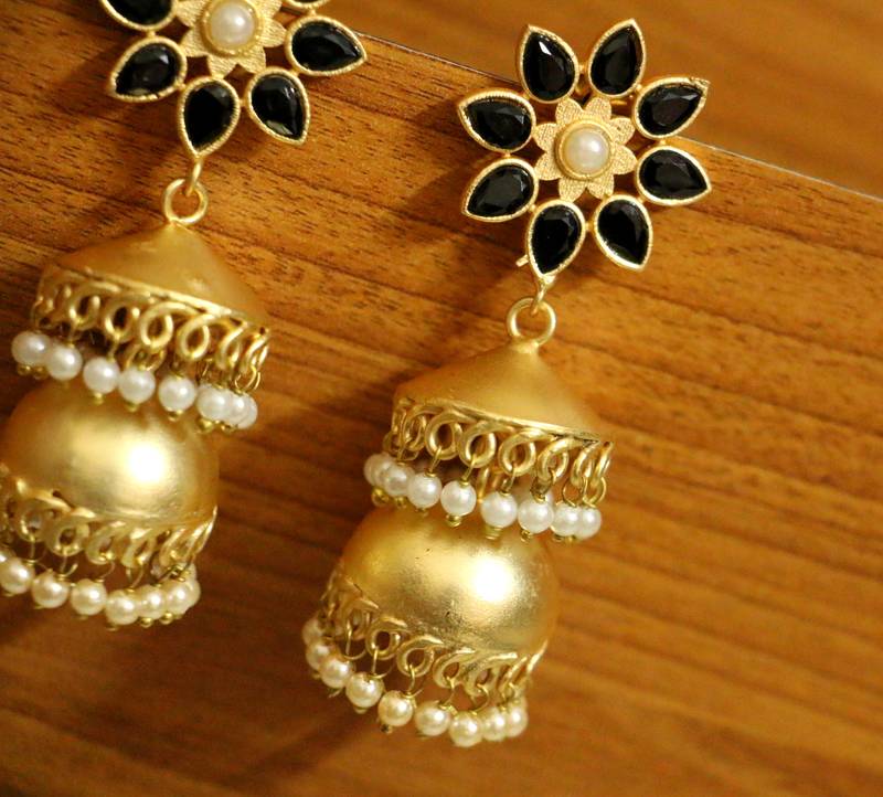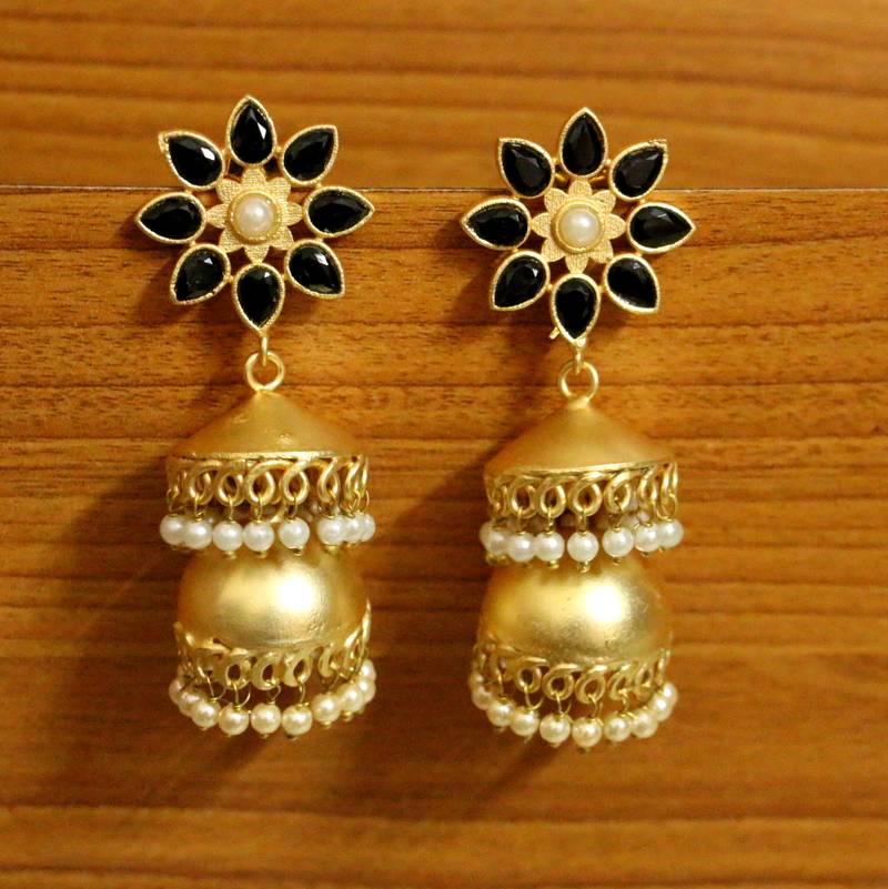 These beautiful earrings are handcrafted in copper alloy with imitation black onyx,pearls & polki with matt finishing work of very fine quality. These earrings are coated with 18 kt yellow gold polish which give them a unique look . An absolutely stunning piece to own and are very light in weight.