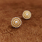 Elegant pearl halo stud earrings featuring a luminous center pearl surrounded by delicate pearl accents and gold detailing. These designer imitation jewellery earrings offer a timeless and sophisticated look, perfect for weddings, festive occasions, office wear, and everyday styling worldwide.