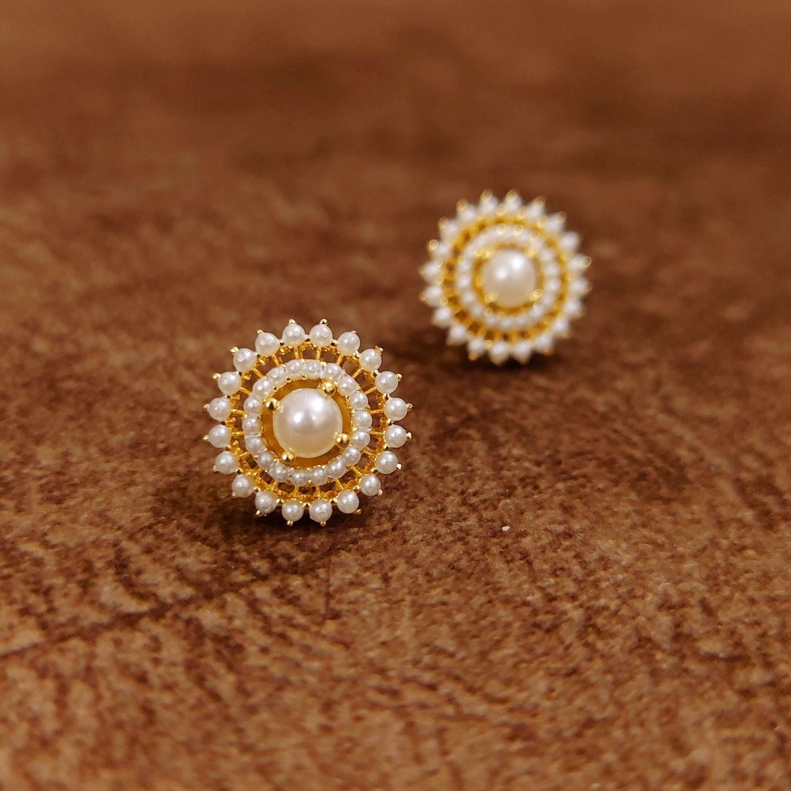 The intricate gold-tone finish adds warmth and sophistication to the design while highlighting the beauty of the pearls. Lightweight and comfortable, these studs are perfect for all-day wear, whether you're attending a wedding, festive celebration, formal event, or simply adding elegance to your everyday outfit.
