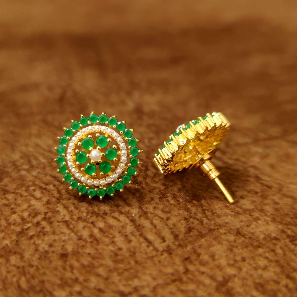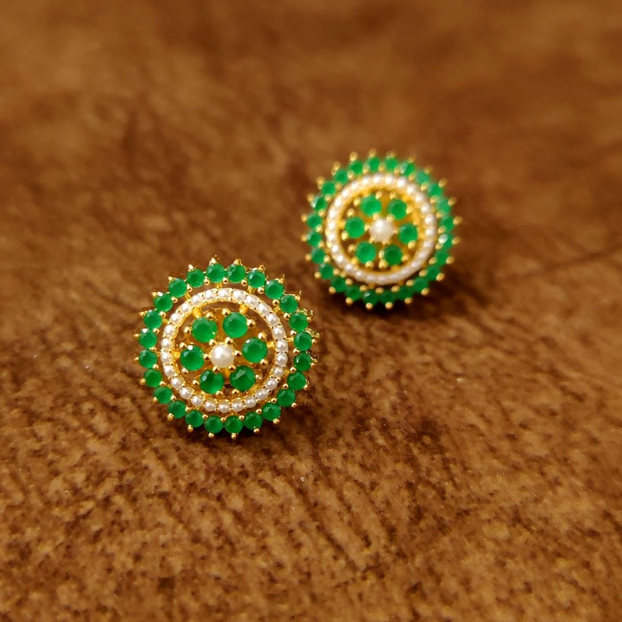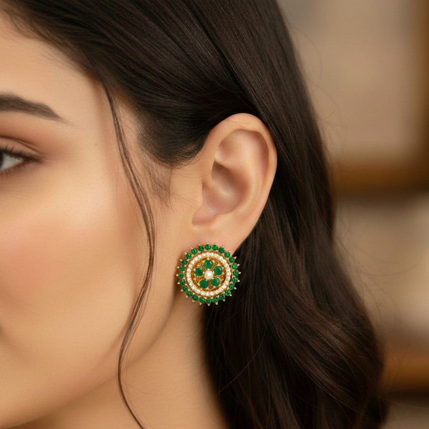 Add a touch of timeless elegance to your jewellery collection with these exquisite Emerald Halo Pearl Stud Earrings from Sanvi Jewels. Designed with a delicate circular floral pattern, these earrings feature vibrant green stones surrounded by fine pearl detailing and a luxurious gold-tone finish that enhances their premium appeal.