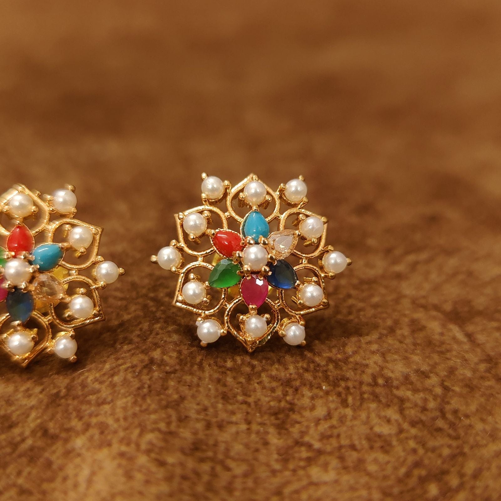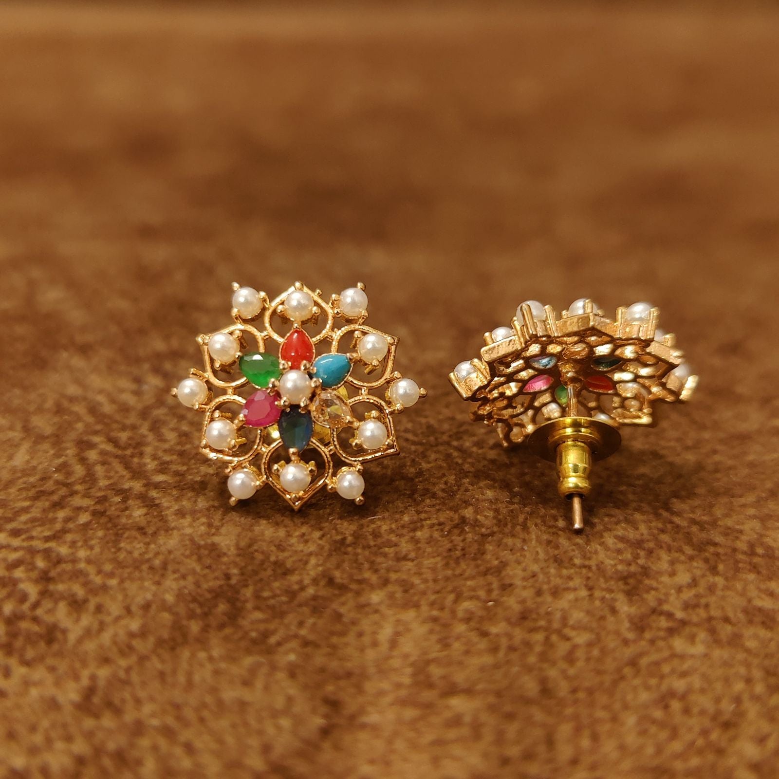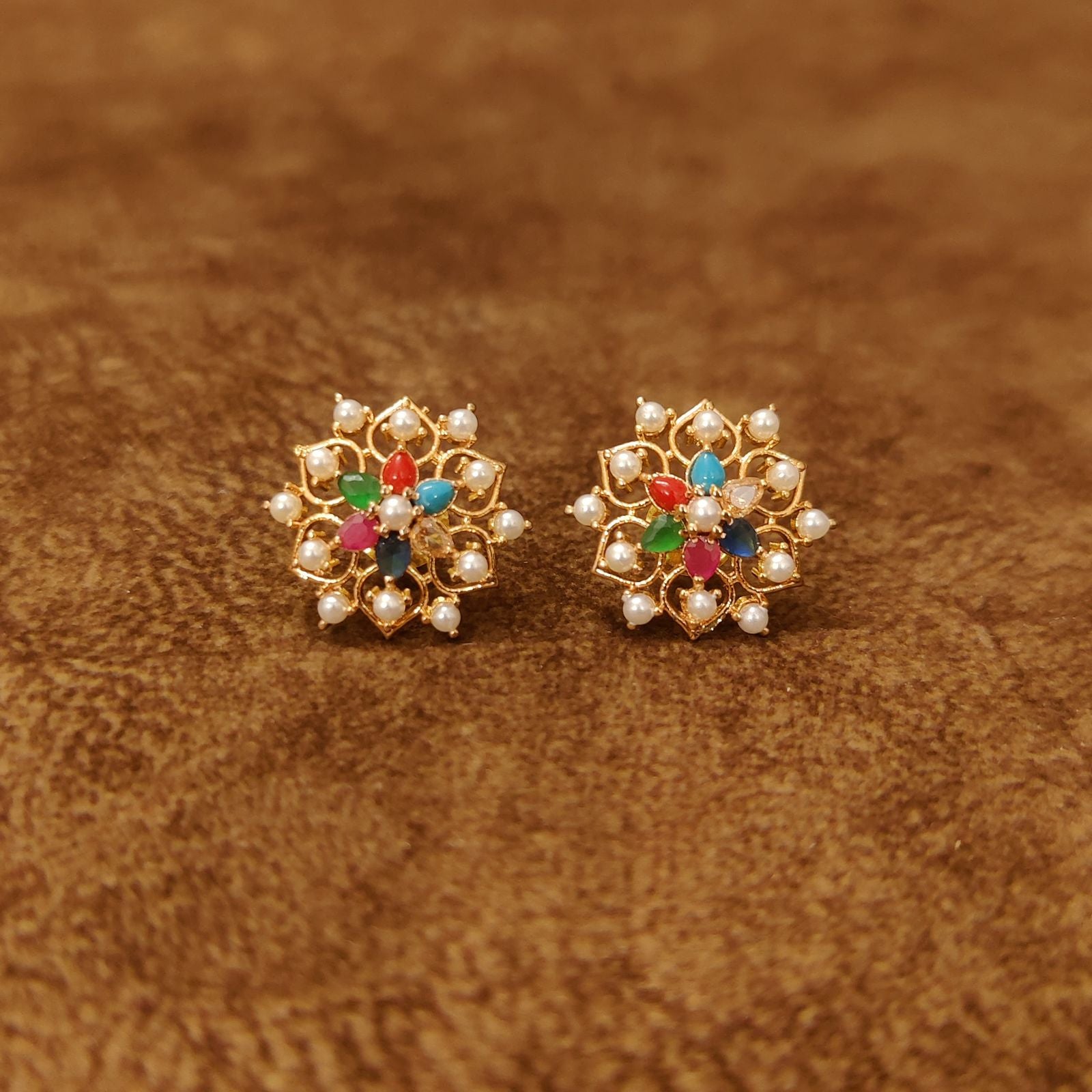 Floral Navratna Pearl Stud Earrings for Women