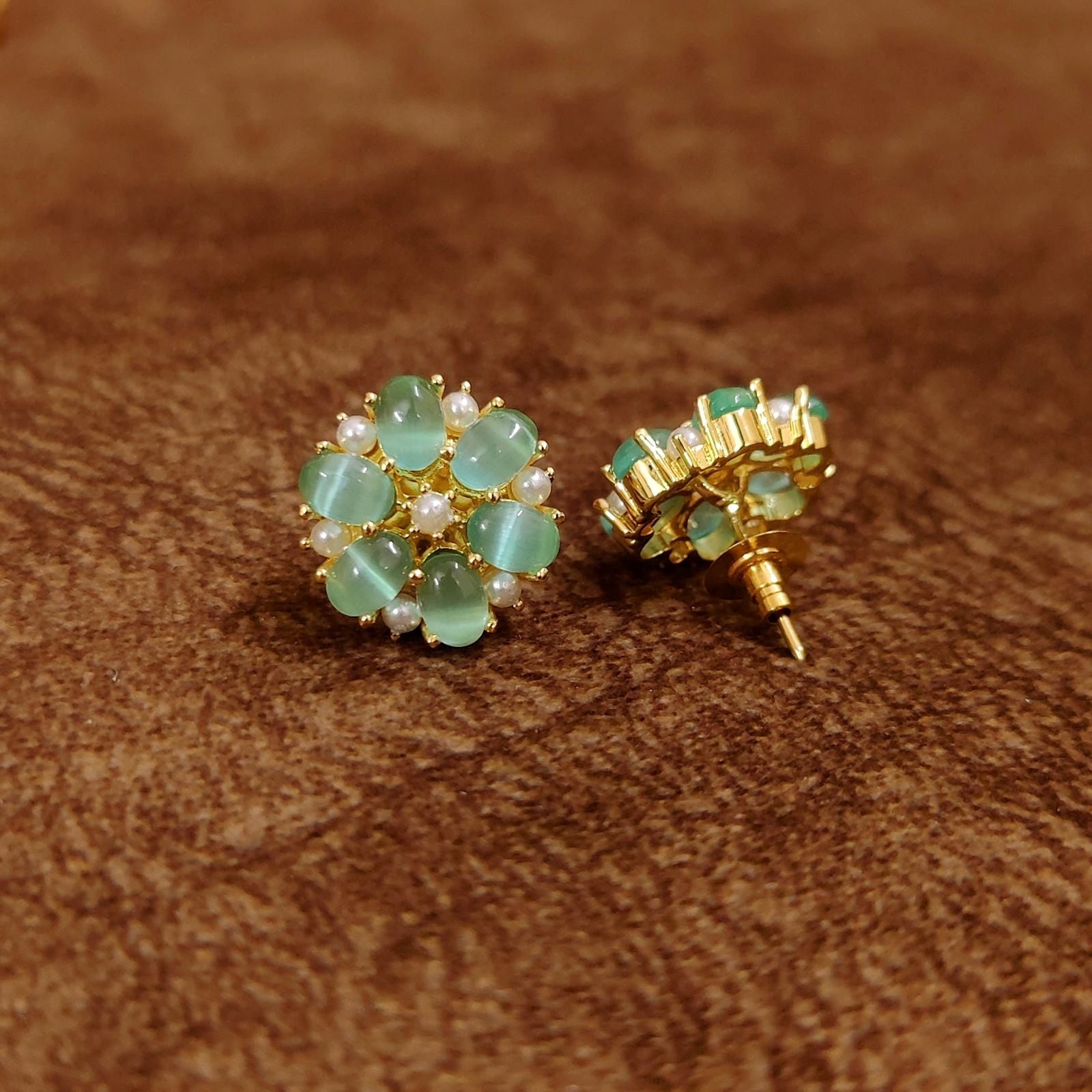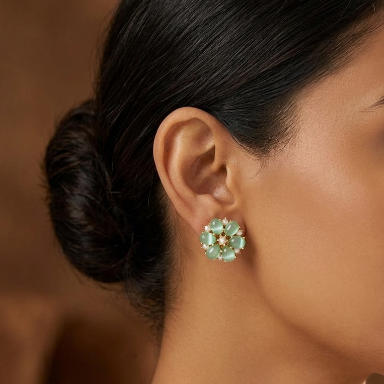 Elegant mint green floral stud earrings featuring soft pastel green stones arranged in a delicate flower design with pearl accents. These designer imitation jewellery earrings offer a sophisticated and modern look perfect for weddings, festive occasions, and everyday styling worldwide.