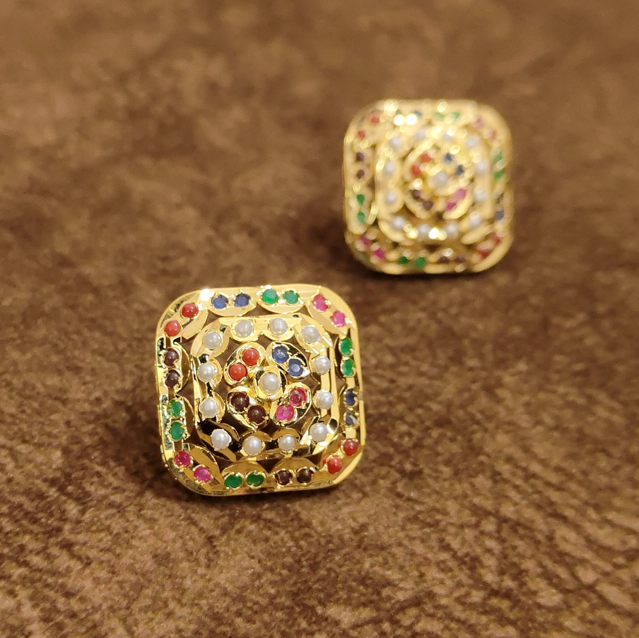 Elegant navratna square stud earrings crafted with vibrant multicolor stones and pearl detailing in a traditional gold-tone setting. These designer imitation jewellery earrings bring royal Indian charm and are perfect for festive occasions, weddings, and ethnic styling worldwide.