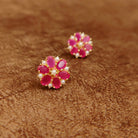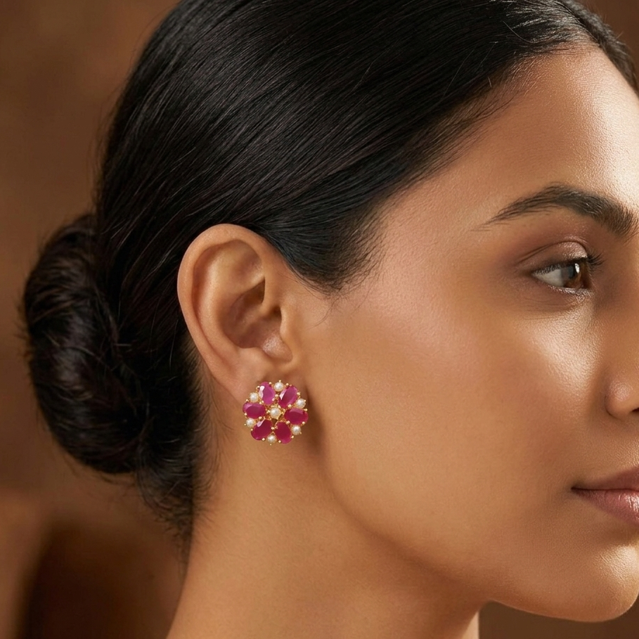 Elegant ruby pink floral stud earrings featuring vibrant pink stones arranged in a delicate flower design with pearl accents. These designer imitation jewellery earrings offer a luxurious festive look perfect for weddings, parties, and everyday styling worldwide.