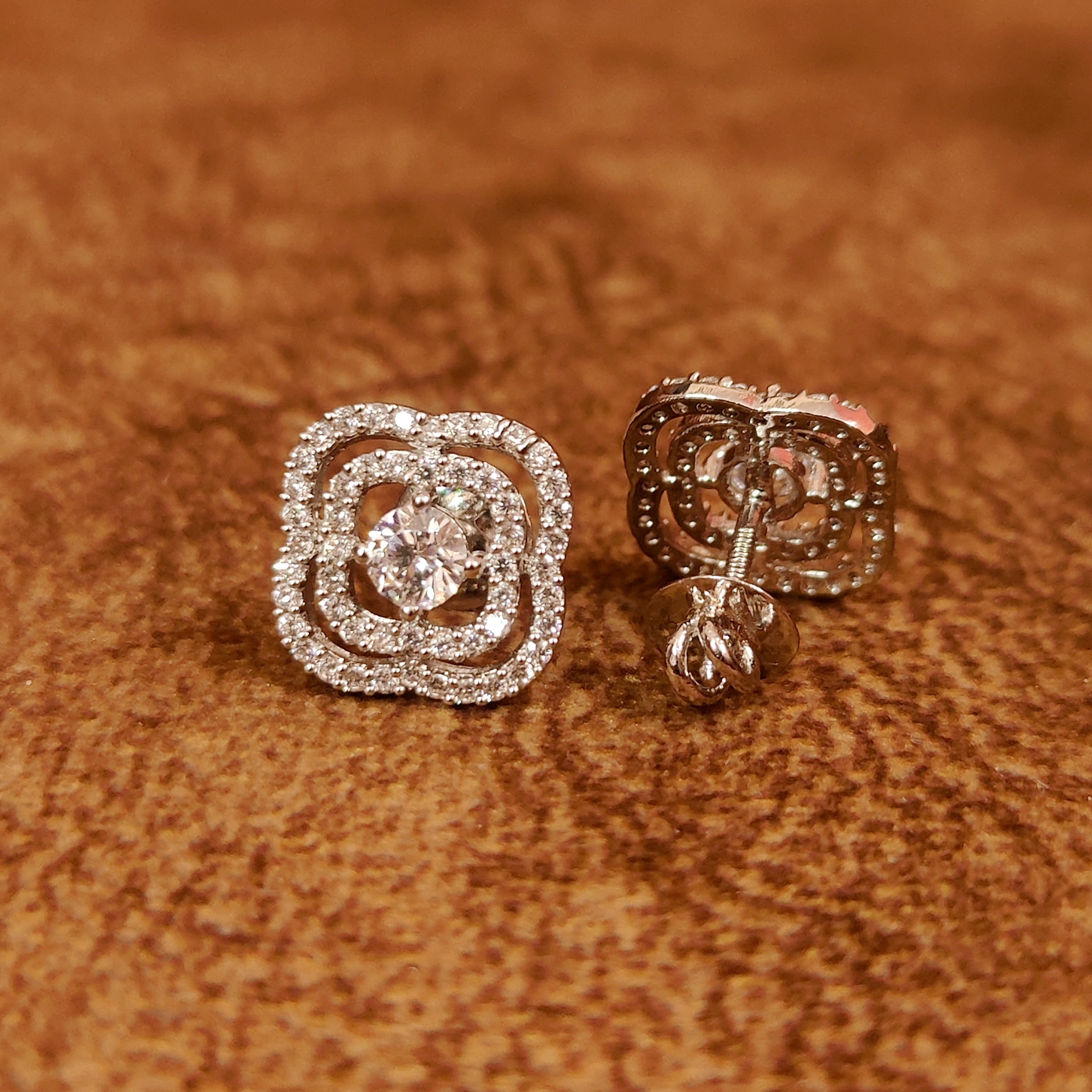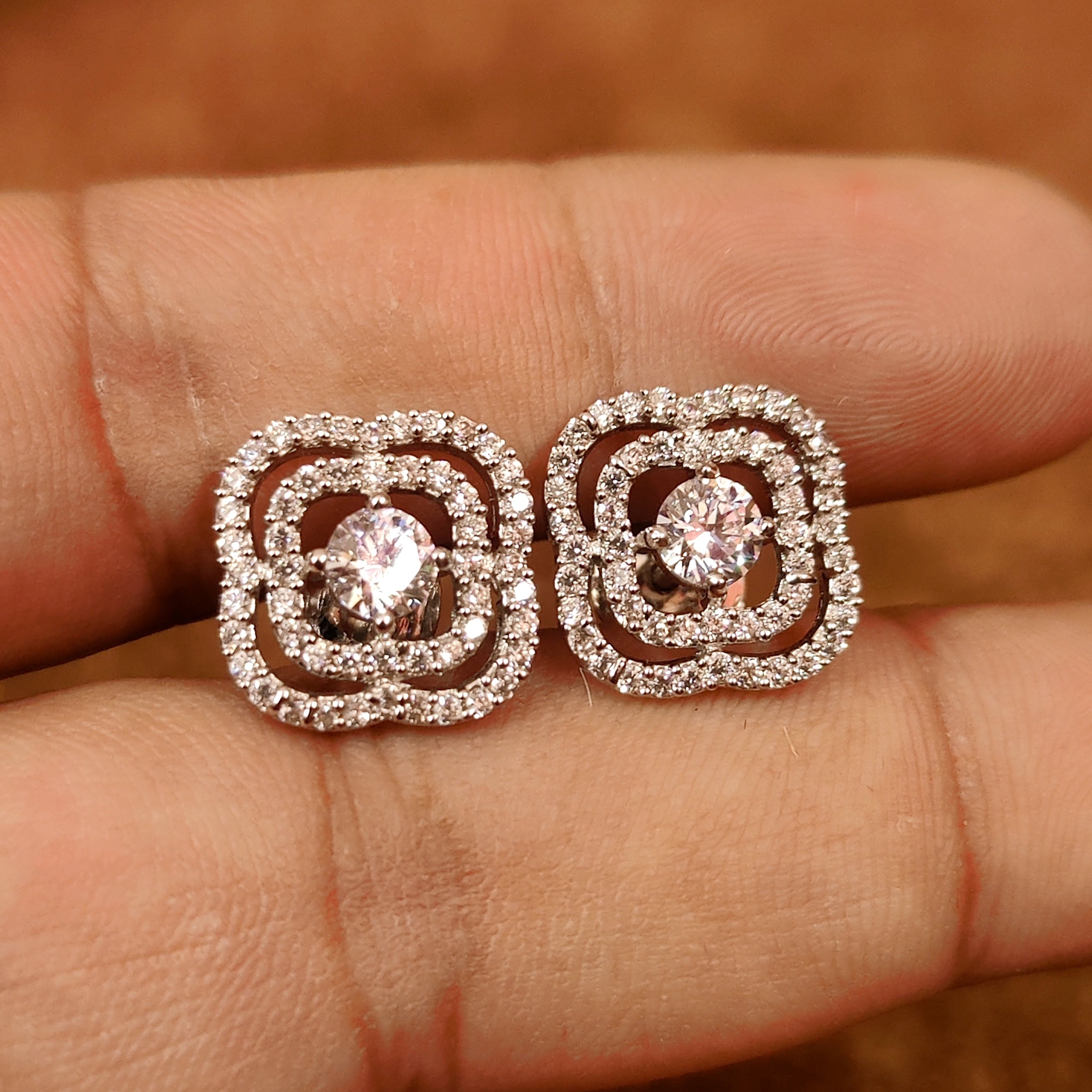 Add a touch of elegance to your daily wear with our 92.5 STERLING SILVER DIAMOND LOOK STUDS. Featuring a trendy design with diamond look alike pattern and signity fine stones, these studs are plated with white gold rhodium for a stunning shine. The screw pattern ensures a secure fit. Elevate your style with these affordable luxury earrings!