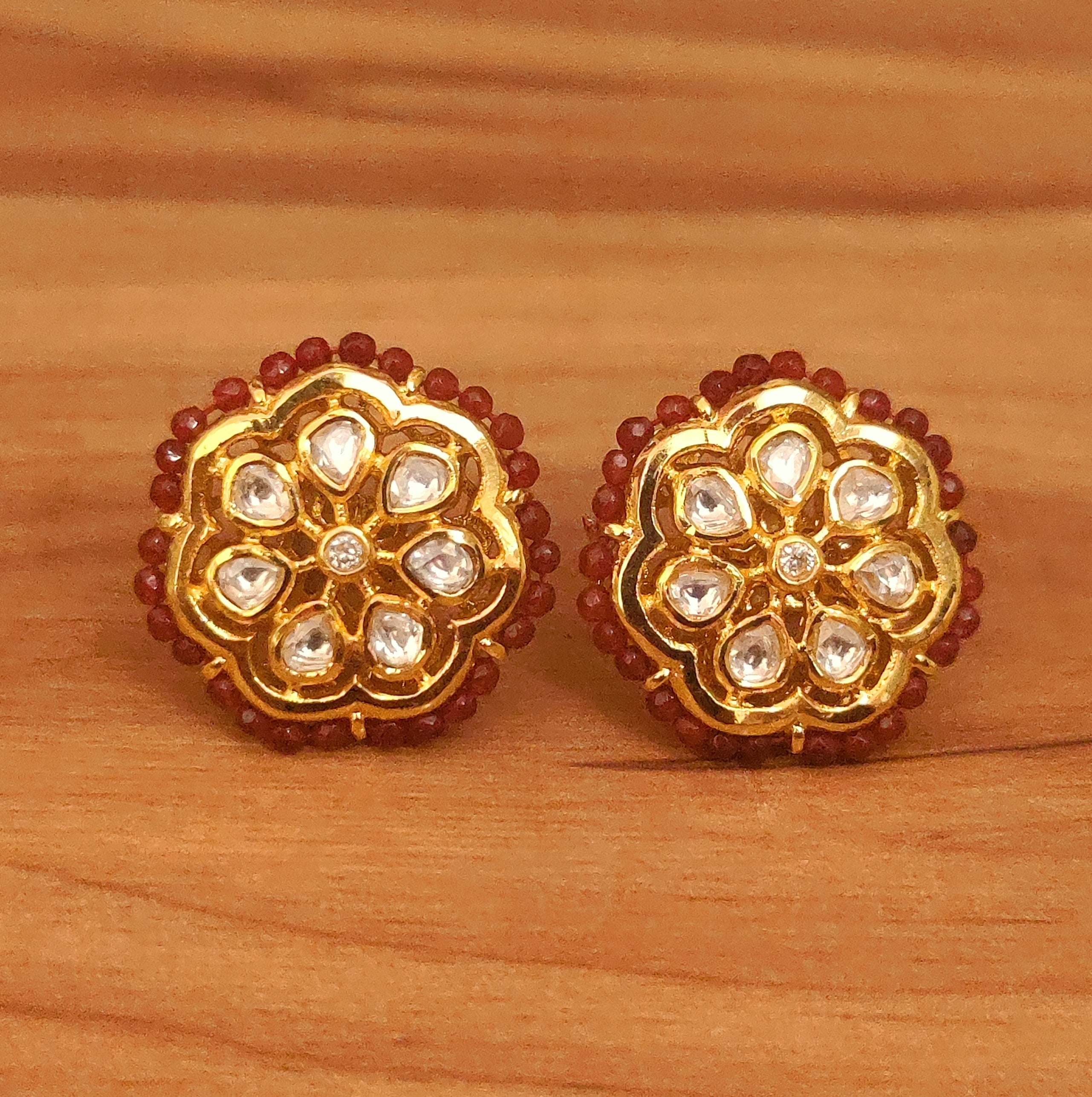 These beautiful studs are handcrafted in brass alloy with imitation semi precious red colour beads & kundan polki stone of very fine quality. these artistic yet modern earrings are plated with high quality gold rhodium. the earrings are very light in weight.