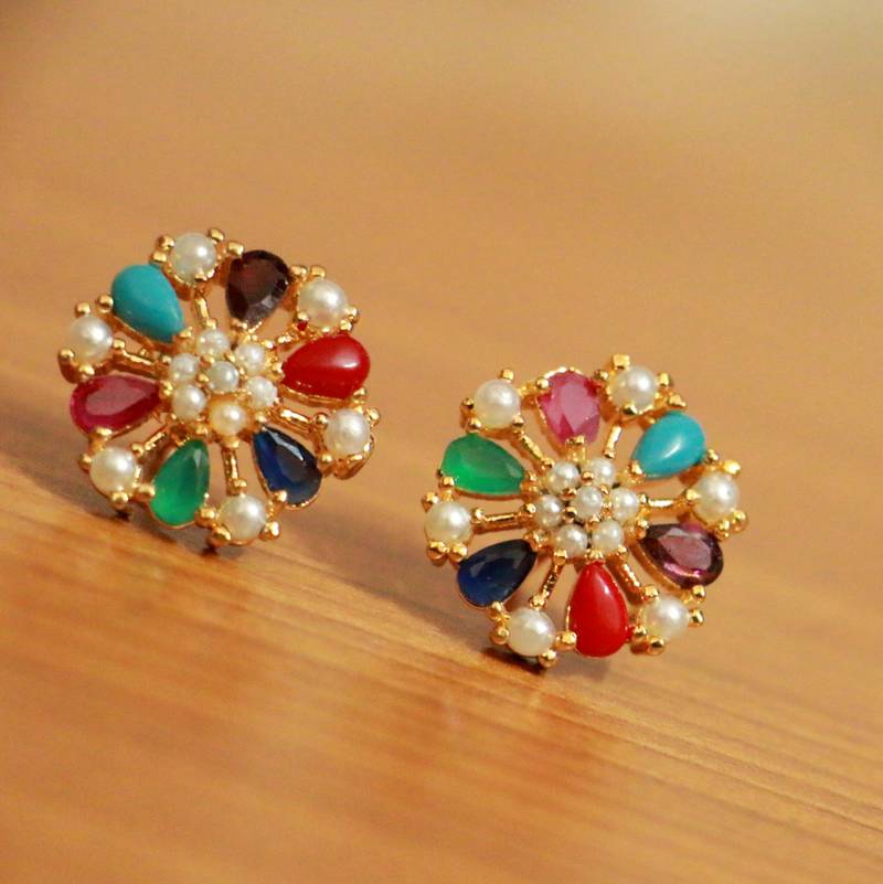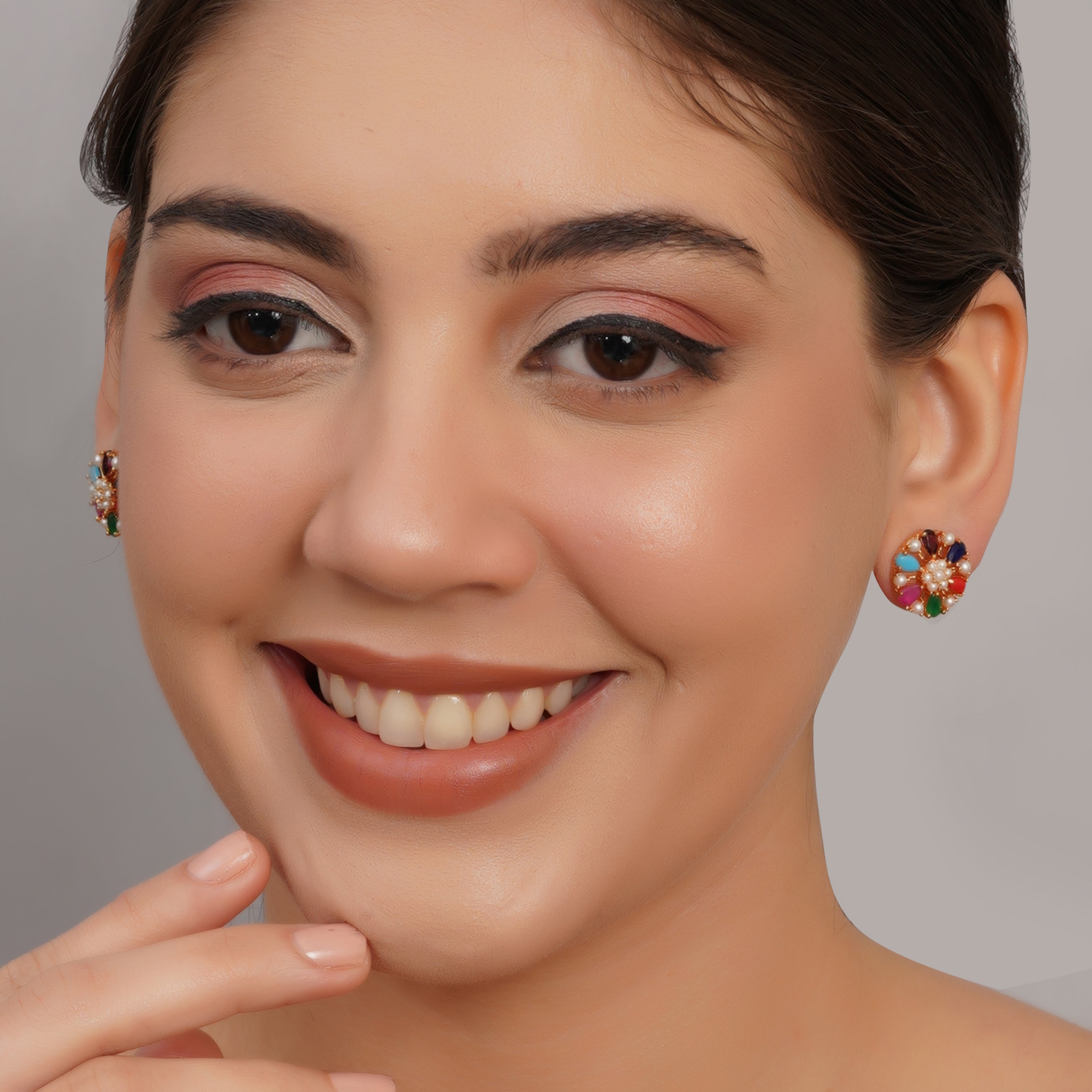 These Navratan Studs Are Handcrafted In Silver Alloy With Imitation Pearls & Multi Colour Stone Of Very Fine Quality. These Artistic Yet Modern Studs Are Plated With High Quality Gold Rhodium. The Earrings Are Very Light In Weight.