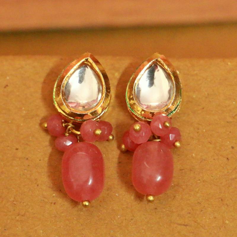 This earrings is handcrafted in silver alloy with imitation pink onyx & kundan with meenakari work of very fine quality , this earrings is coated with 18kt nickle free gold plating to avoid skin allergies and its very light in weight .