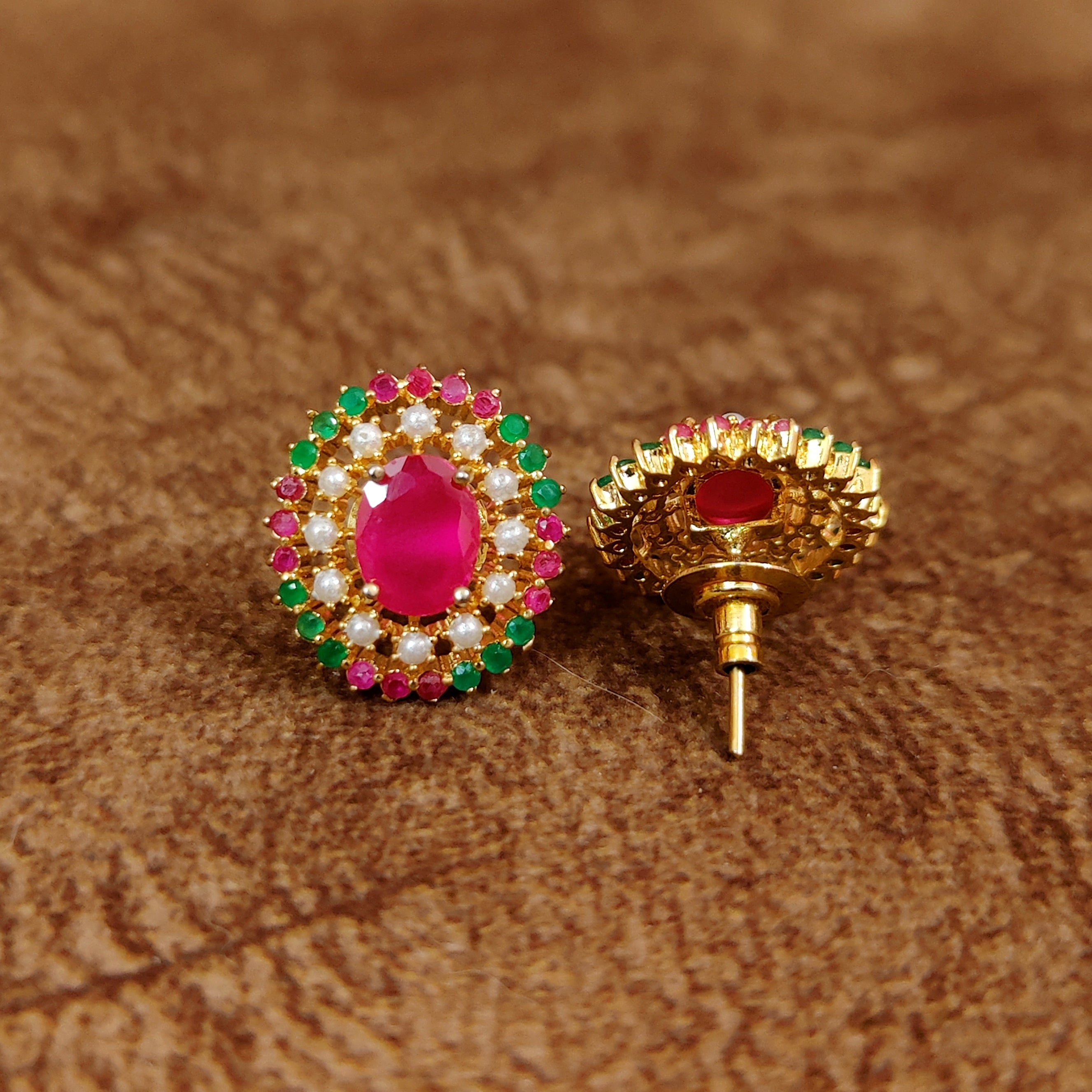 RUBY & EMERALD GOLD PLATED PEARL STUDS